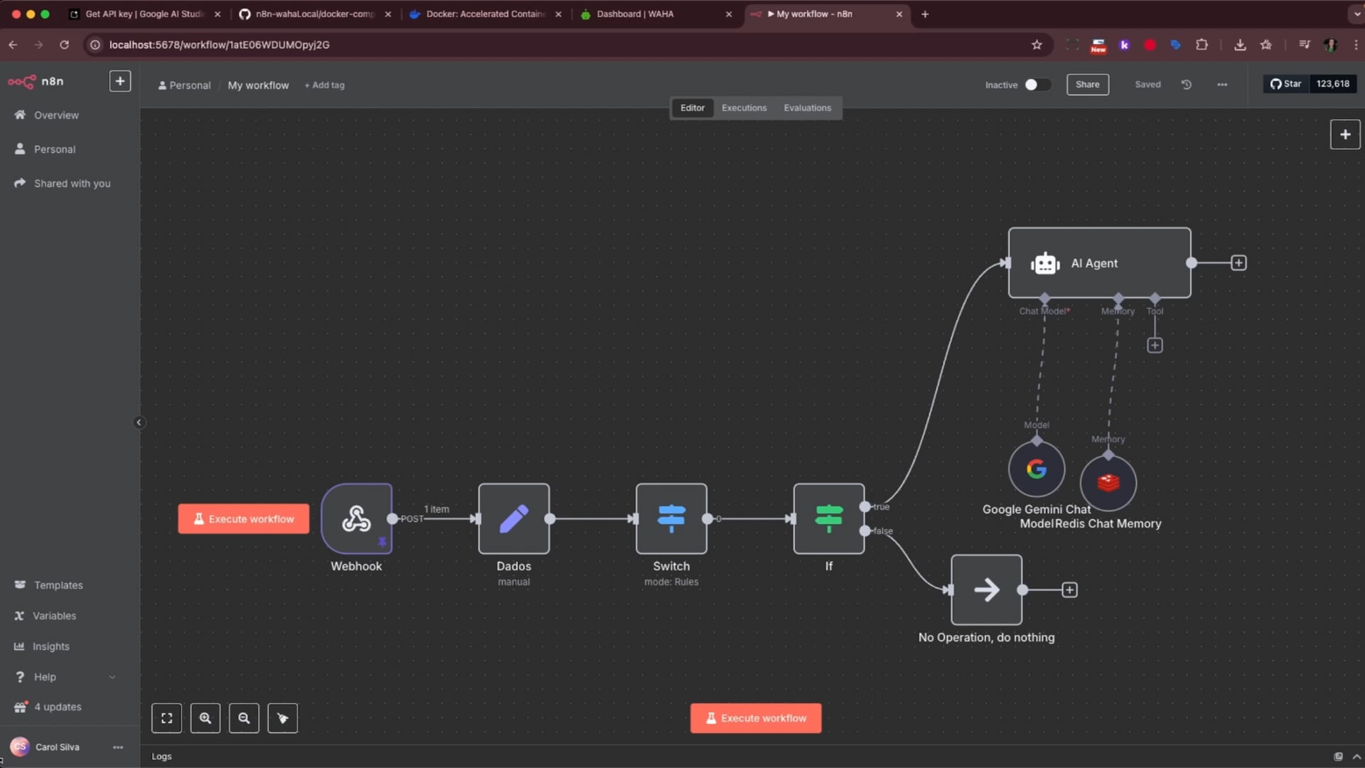 Adicionamos e configuramos nós no n8n para enviar e receber mensagens do WhatsApp usando a API WAHA. Estabelecemos conexões, capturamos IDs de sessão e chat, e automatizamos respostas do agente.