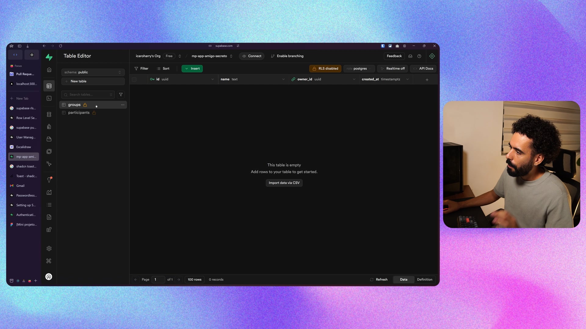 Configuramos a criação de grupos e participantes para um app de Amigo Secreto usando Next.js e Supabase. Implementamos inserção e sorteio dos participantes no banco de dados, preparando para o próximo passo: envio de e-mails.