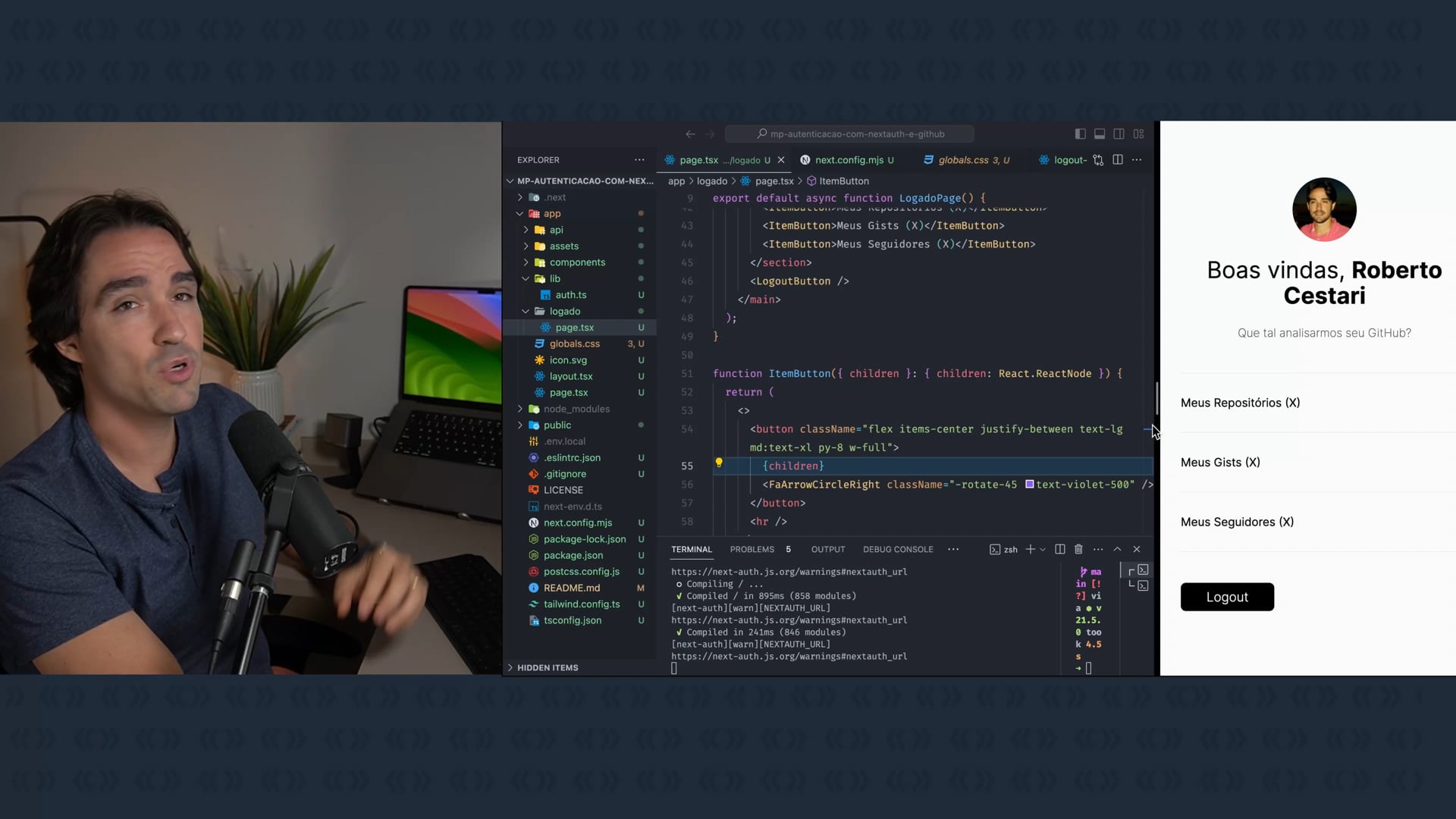 Exploramos toda a sequência de criação e personalização, desde o design básico até a implementação de botões de login e logout e redirecionamento condicional. Também detalhamos como configurar NextAuth para extrair mais dados do Github, além dos básicos previamente fornecidos.