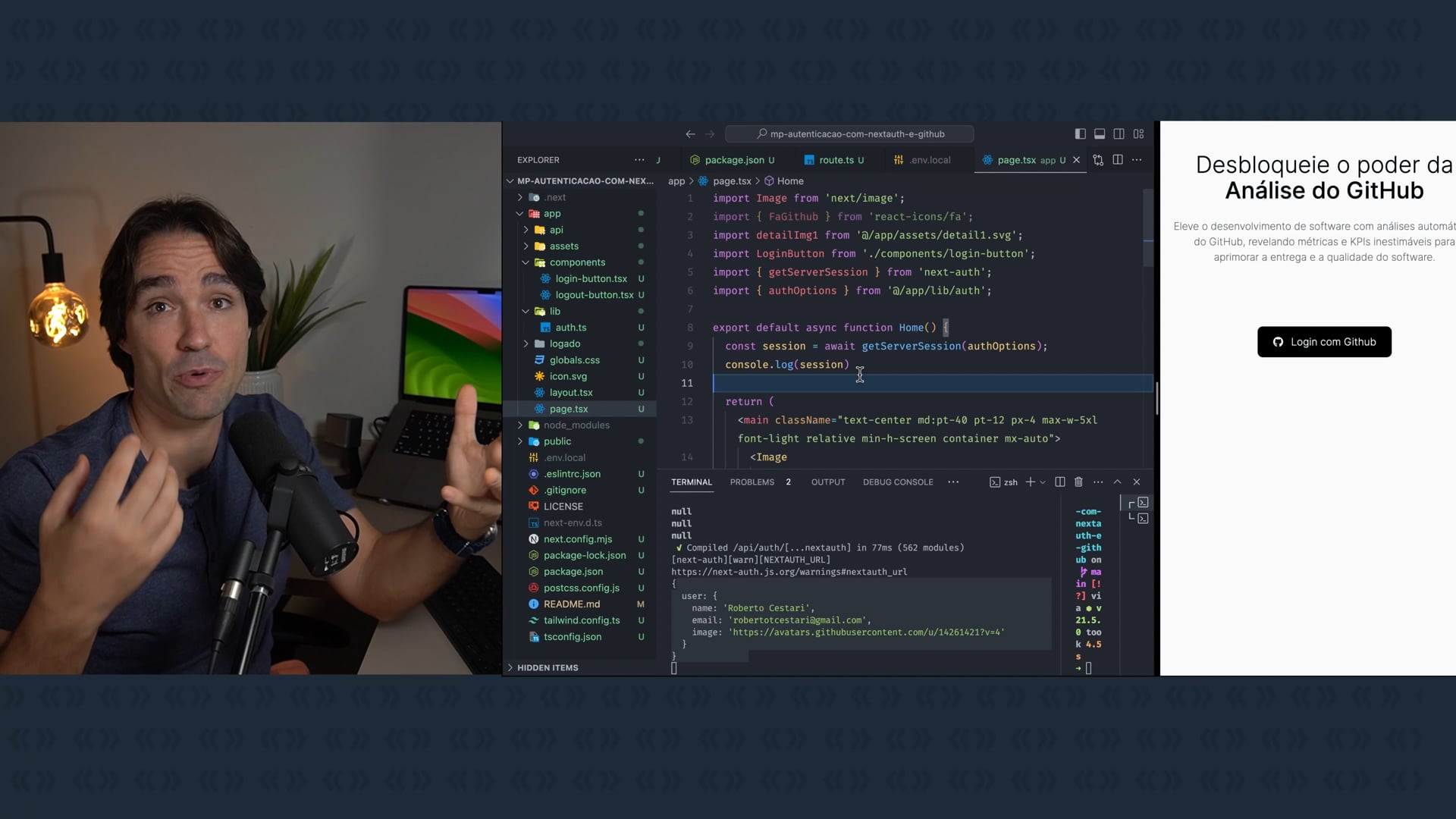 Implementamos redirecionamentos condicionais para a aplicação Next de autenticação com Github e NextAuth. Projetamos para redirecionar os usuários para a página logada quando estiverem logados e para a página inicial quando deslogados. Também começamos a personalizar os elementos da interface do usuário.