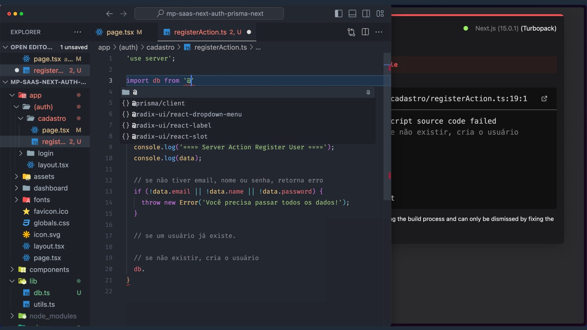 Criamos a funcionalidade de cadastro de usuário, usando Prisma para persistência e bcrypt-ts para criptografia de senhas. Implementamos validação de existência de usuário e planejamos integrar com NextAuth para autenticação.