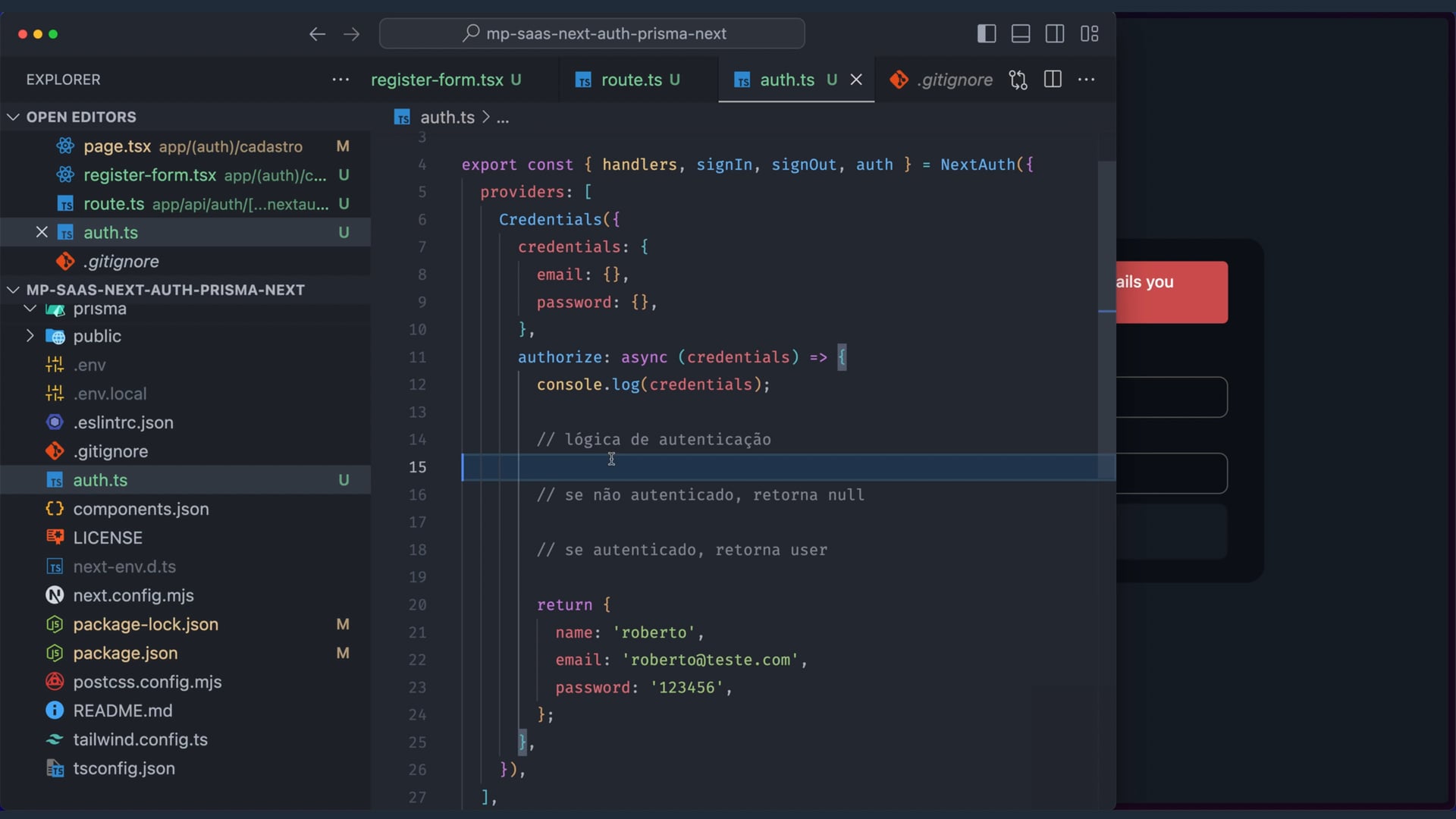 Implementamos a função `findUserByCredentials` para validar usuários usando e-mail e senha com criptografia hash em nossa aplicação Next.js. Após ajuste de registros, conseguimos autenticar o usuário verificando seus dados no banco.
