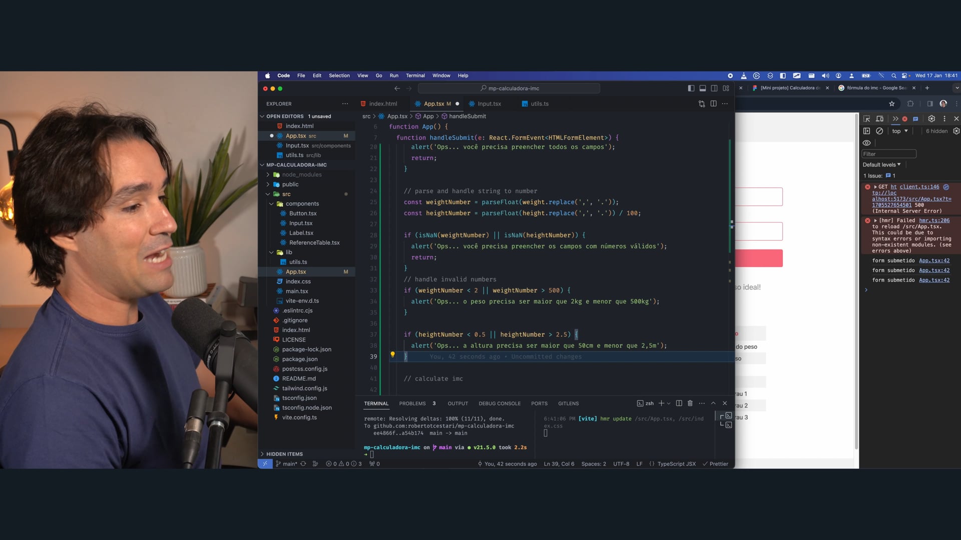 No fim, o cálculo do IMC é a parte mais simples da aplicação. Vamos extraí-lo para uma função à parte. Também vamos criar o estado para que o cálculo seja refletido na UI.