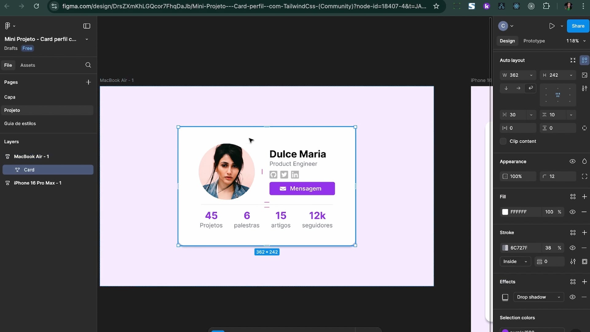 Criamos a estrutura HTML do card de perfil, organizando elementos em divs para a imagem, título, profissão, ícones e botão de mensagem. Utilizamos o Figma como referência para recriação visual.
