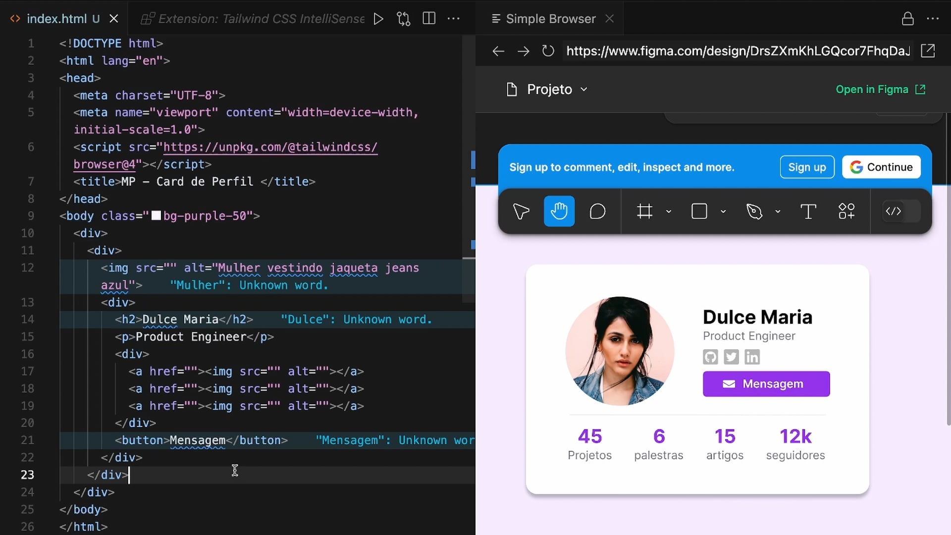 Criamos uma divisão com <hr>, uma lista não ordenada com quatro itens representando projetos, palestras, artigos e seguidores. Exportamos e salvamos imagens e ícones essenciais do Figma para usar no projeto.