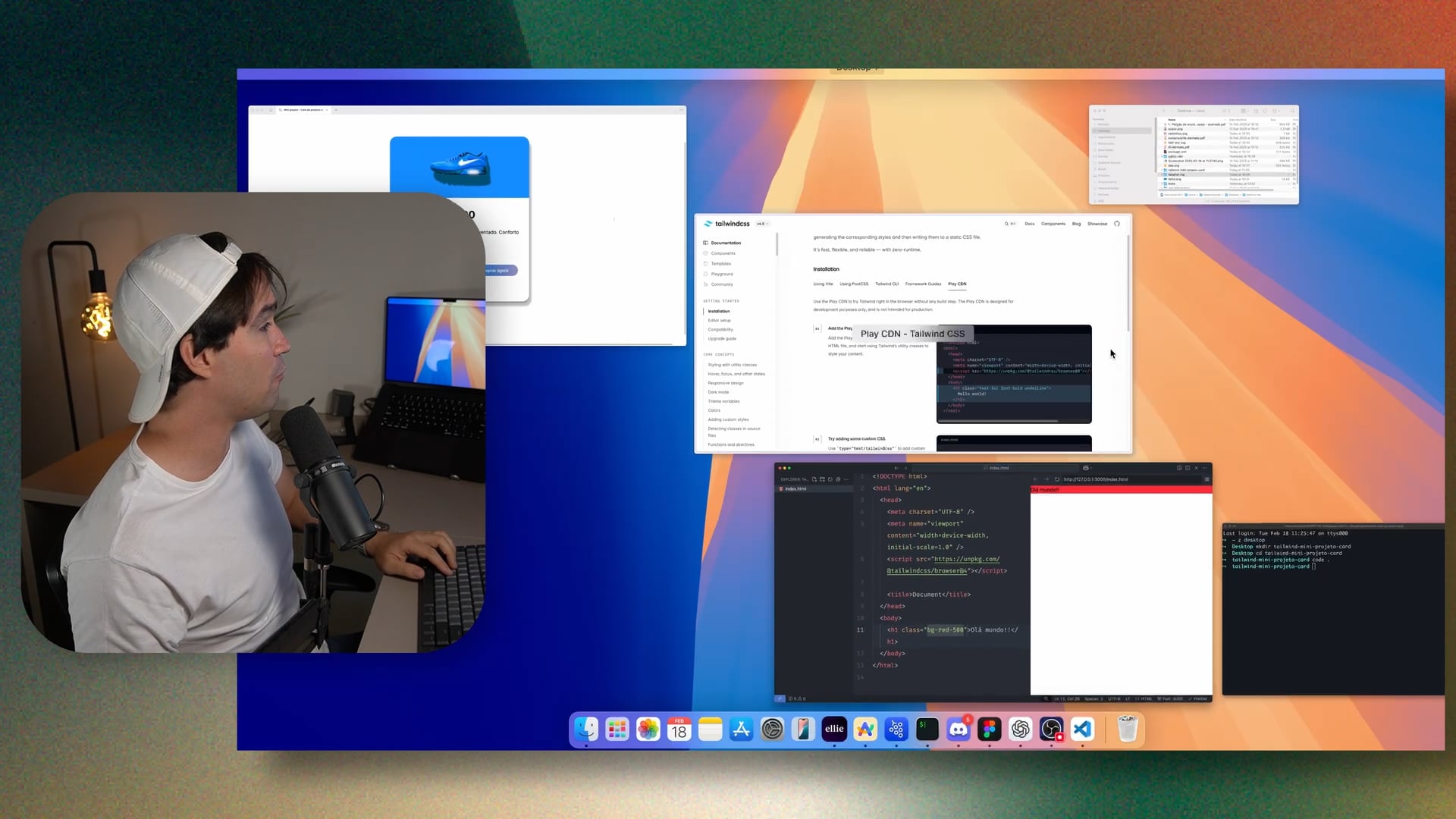 Estamos transcrevendo elementos de um design no Figma para HTML, criando a estrutura básica de um card de produto. Definimos divs, imagens, texto, preço e botão, preparando tudo para estilização futura.