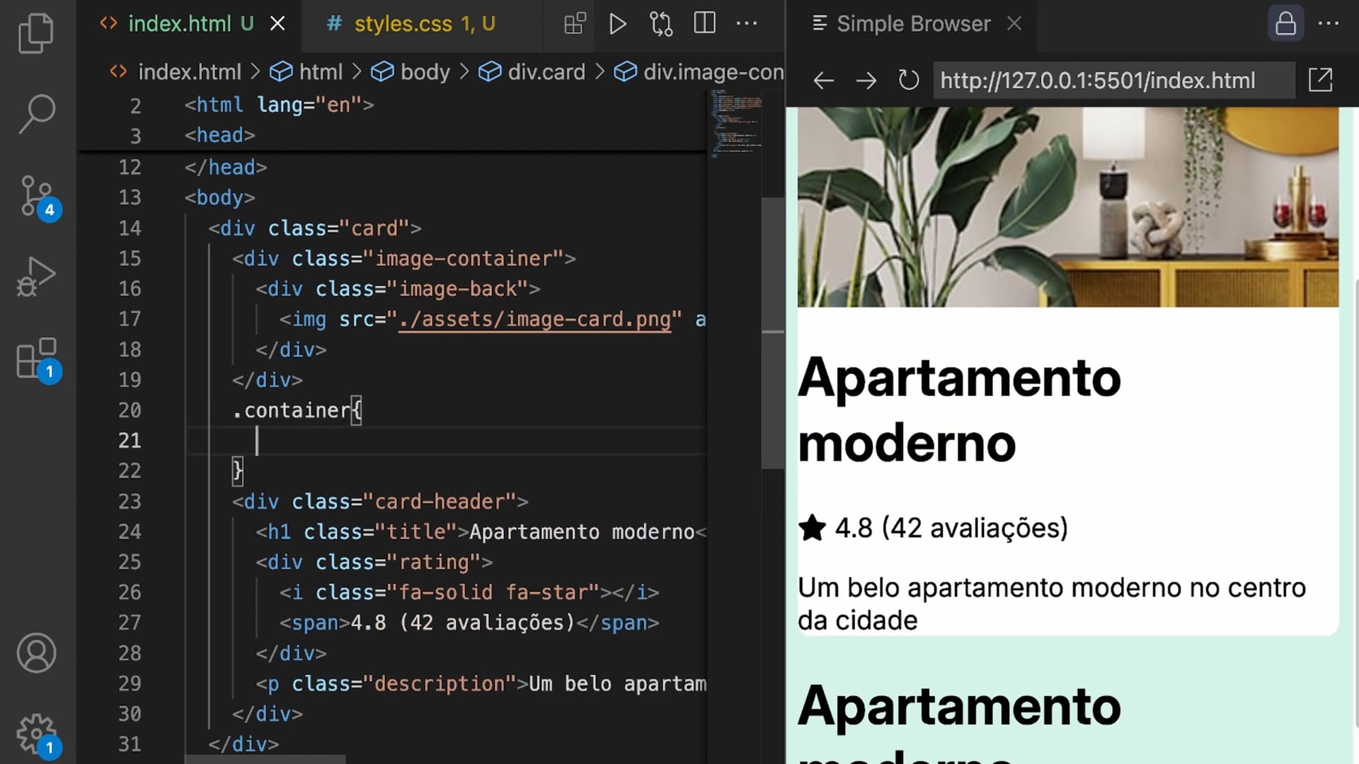 Criamos classes CSS para estruturar o card de imobiliária, adicionando conteúdo e ícones representando metros quadrados, quartos e localização. Utilizamos flexbox para centralizar o card na tela, preparando-o para diferentes ajustes de layout.