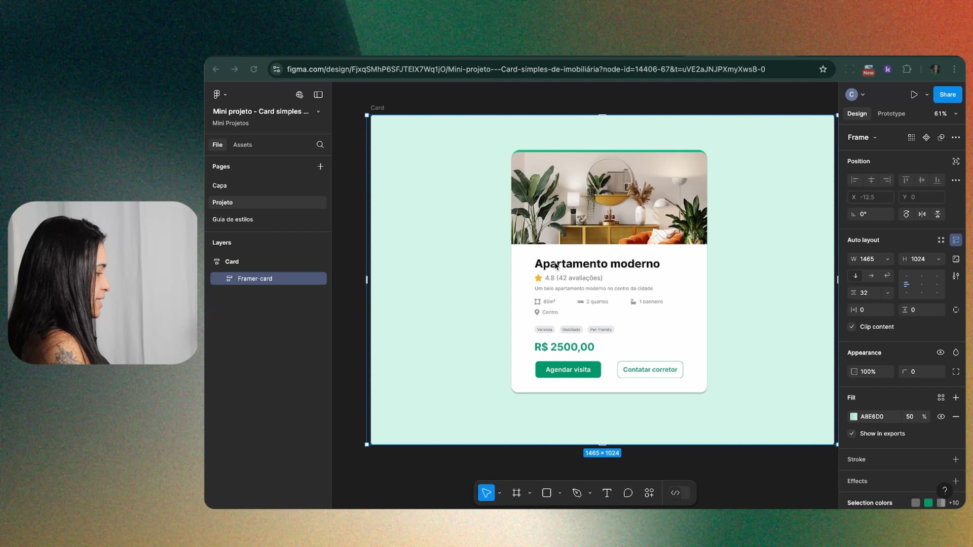 Criamos uma estrutura de HTML para o card da imobiliária, incluindo uma div com classe para o card e container da imagem. Exportamos a imagem para o projeto e verificamos sua exibição.