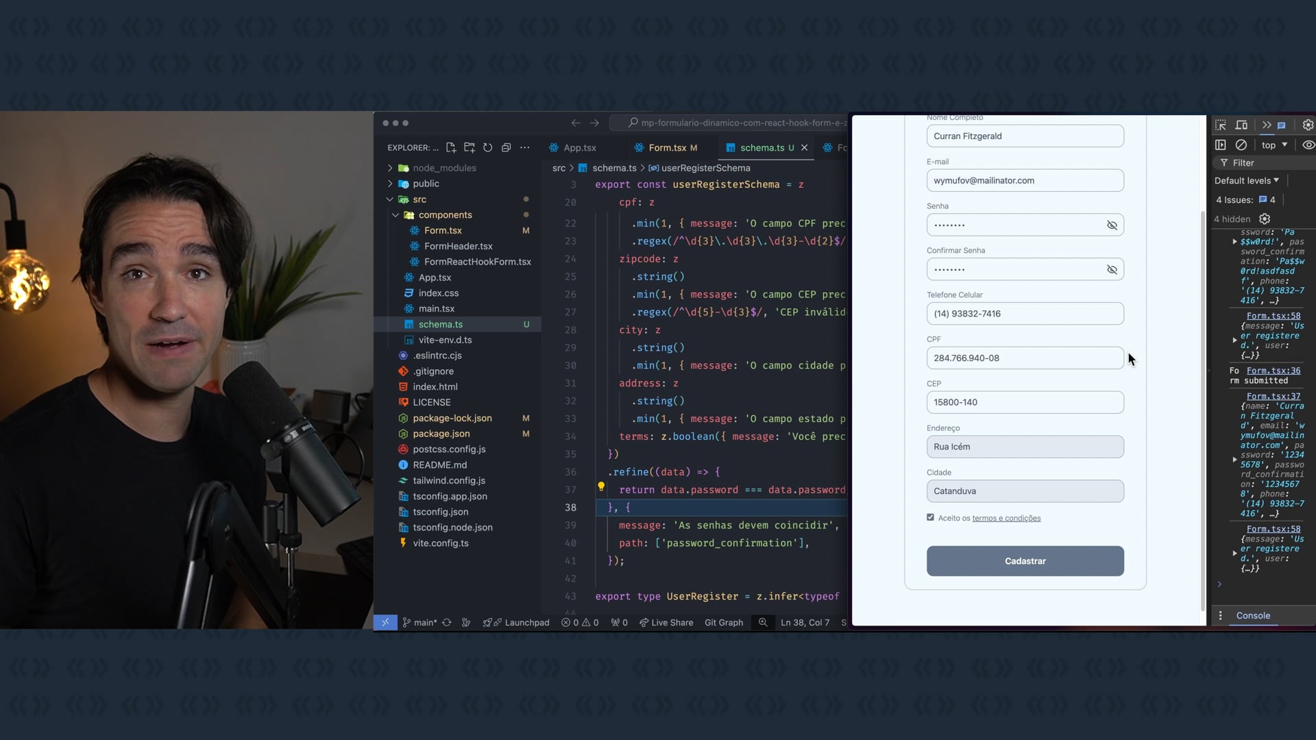 Vamos adicionar o pacote `react-hot-toast` para mostrar mensagens de sucesso e erro no cadastro. Integramos o `Toaster` ao `main.tsx` e configuramos os toasts para feedback ao usuário. Além disso, vamos limpar o formulário automaticamente após cadastro bem-sucedido.