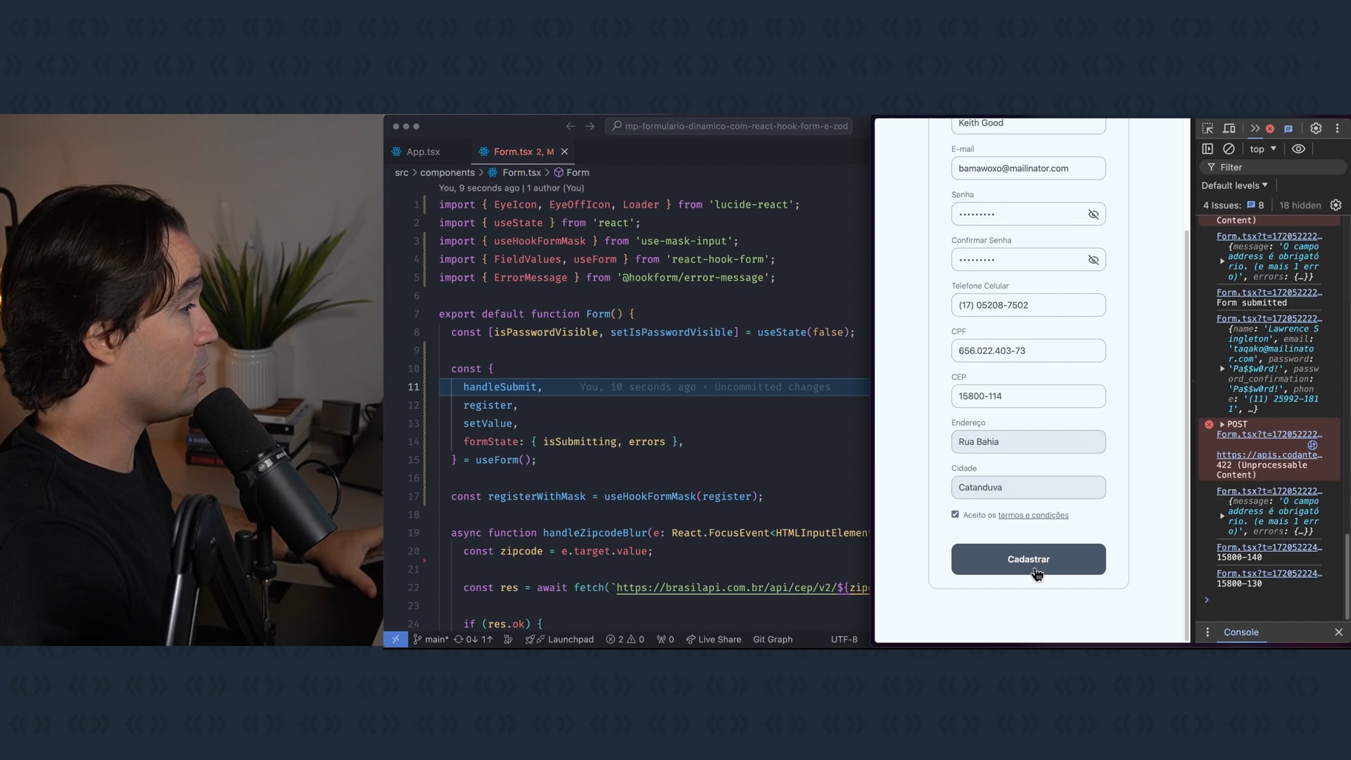 Preenchemos o formulário com dados falsos e validamos o CPF. Adicionamos uma validação customizada para garantir que as senhas coincidem. Implementamos um `validate` no campo de confirmação de senha e testamos para evitar mensagens incorretas de sucesso.