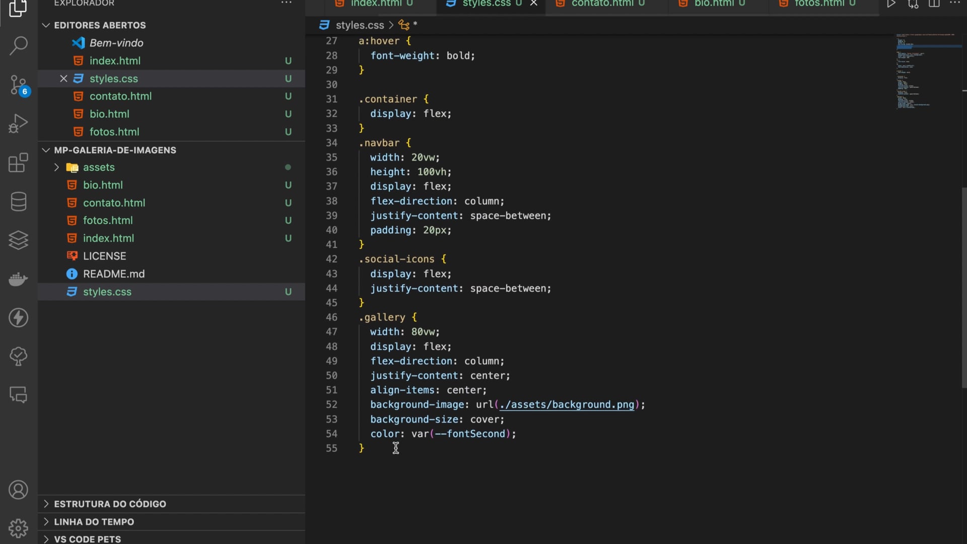 Ajustamos o botão `ver mais` aplicando cor e font-weight adequados. Alteramos o título para H2 e definimos a classe `gallery-title` para consistência. Clique no botão para acessar a página de fotos.