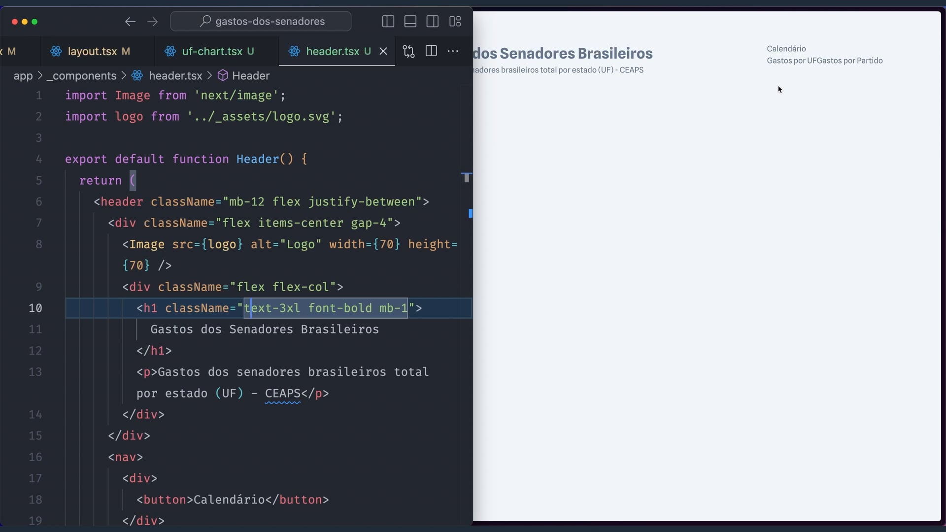 Criamos a barra de navegação no header com botões estilizados utilizando flexbox. Importamos ícones como SVG para calendário, mapa e bandeira, ajustando cores e bordas. Implementamos efeitos de hover para melhorar a interatividade.