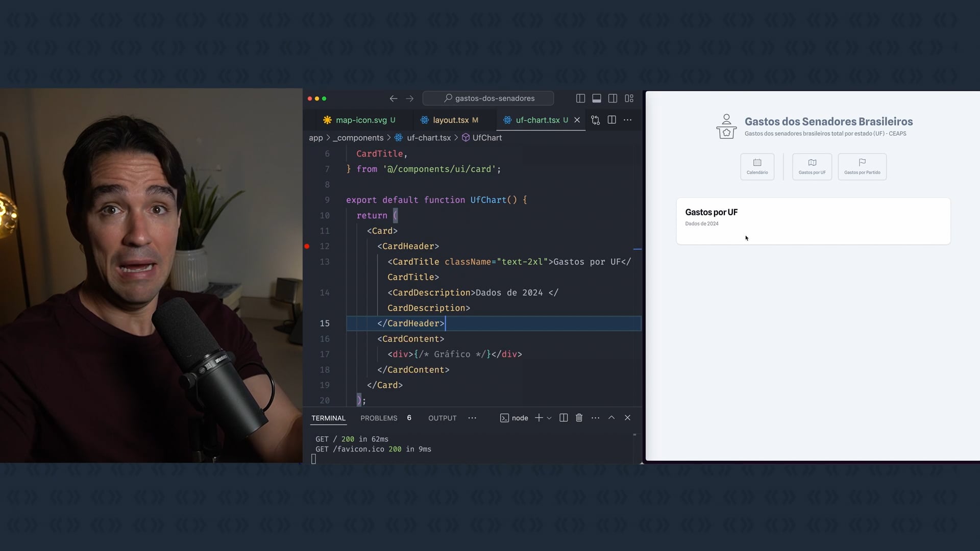 Exploramos como importar e processar dados na nossa aplicação Next.js usando um server component. Realizamos o fetch dos dados agregados por UF, filtramos por ano e preparamos para usar no ShadCN Charts, ajustando os tipos e componentes.