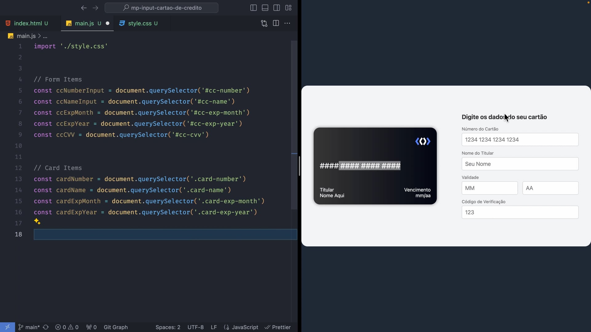 Ensinamos como implementar o event listener para tornar o formulário do cartão de crédito interativo usando JavaScript puro. Trabalhamos na funcionalidade de atualizar o número do cartão em tempo real conforme o usuário insere os dados, incluindo o retorno ao placeholder inicial ao apagar os números. Além disso, formatamos a apresentação do número do cartão em blocos de quatro dígitos.