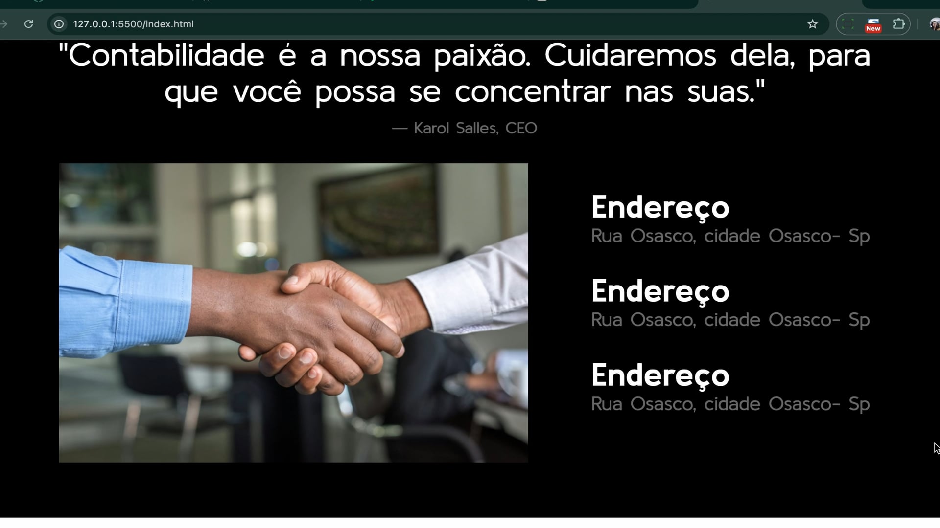 Ajustamos a seção de contato, aumentando a margem inferior das caixas e personalizando textos. Reproduzimos a estrutura de itens, ampliamos as imagens e preparamos a última parte do projeto.