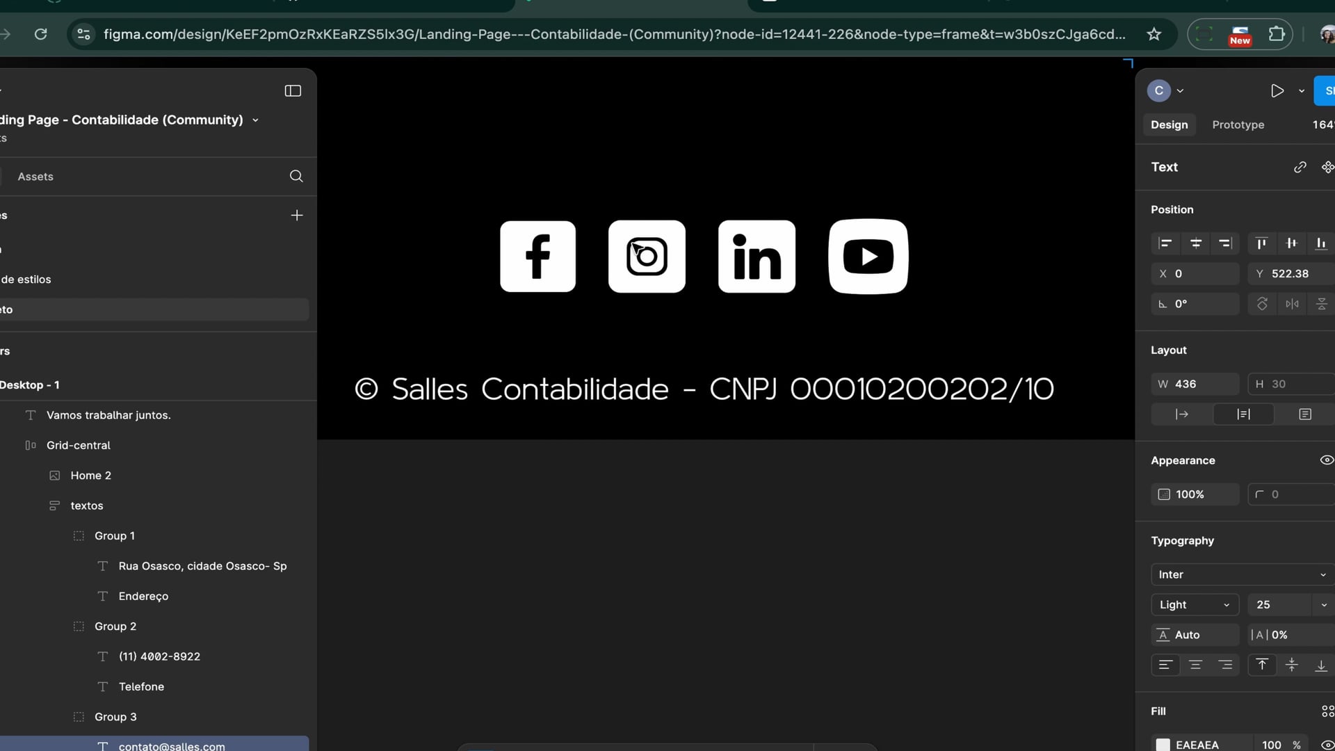 Organizamos o footer da landing page, criando um container para quatro ícones de redes sociais. Usamos elementos inline para alinhamento automático, ajustamos o texto e adicionamos um subtítulo classificado.