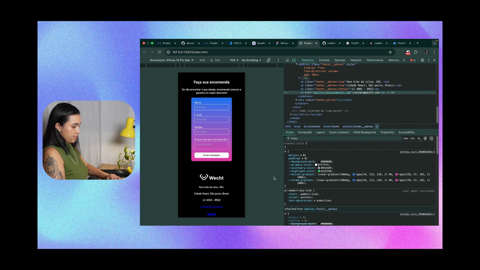 Aplicamos text-decoration underline e ajustamos espaçamento no footer para melhorar a organização. Criamos uma lista de navegação e um botão `Scroll Top` usando CSS flex, border-radius e gradiente. Ajustamos layout e cores para finalizar.