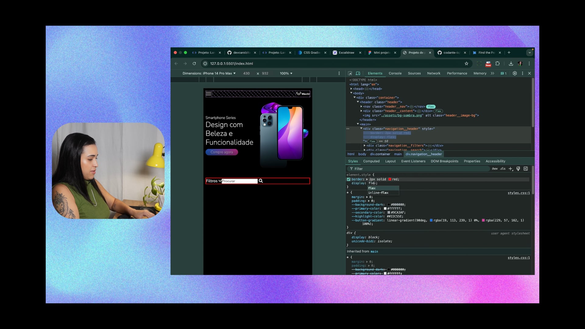 Exploramos técnicas de inspeção e estilização, aplicando CSS com display flex e melhorando a aparência do input. Também, otimizamos imagens no projeto, reduzindo seu tamanho para melhorar a performance do site.