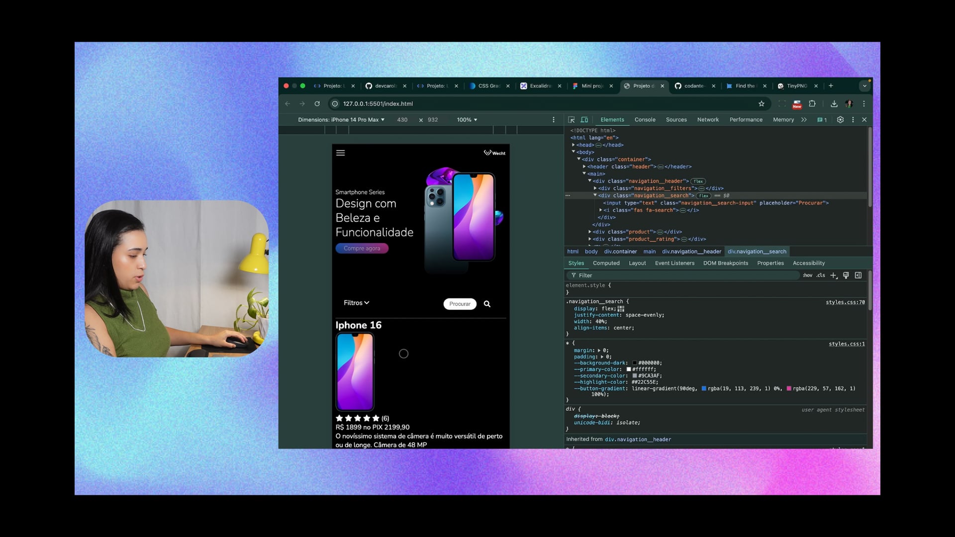 Reorganizamos a estrutura do HTML e CSS para centralizar e espaçar itens na seção de produtos. Aplicamos display flex com flex-direction column e usamos gap. Ajustamos cores, como o amarelo das estrelas e verde nos preços, para melhorar a aparência.
