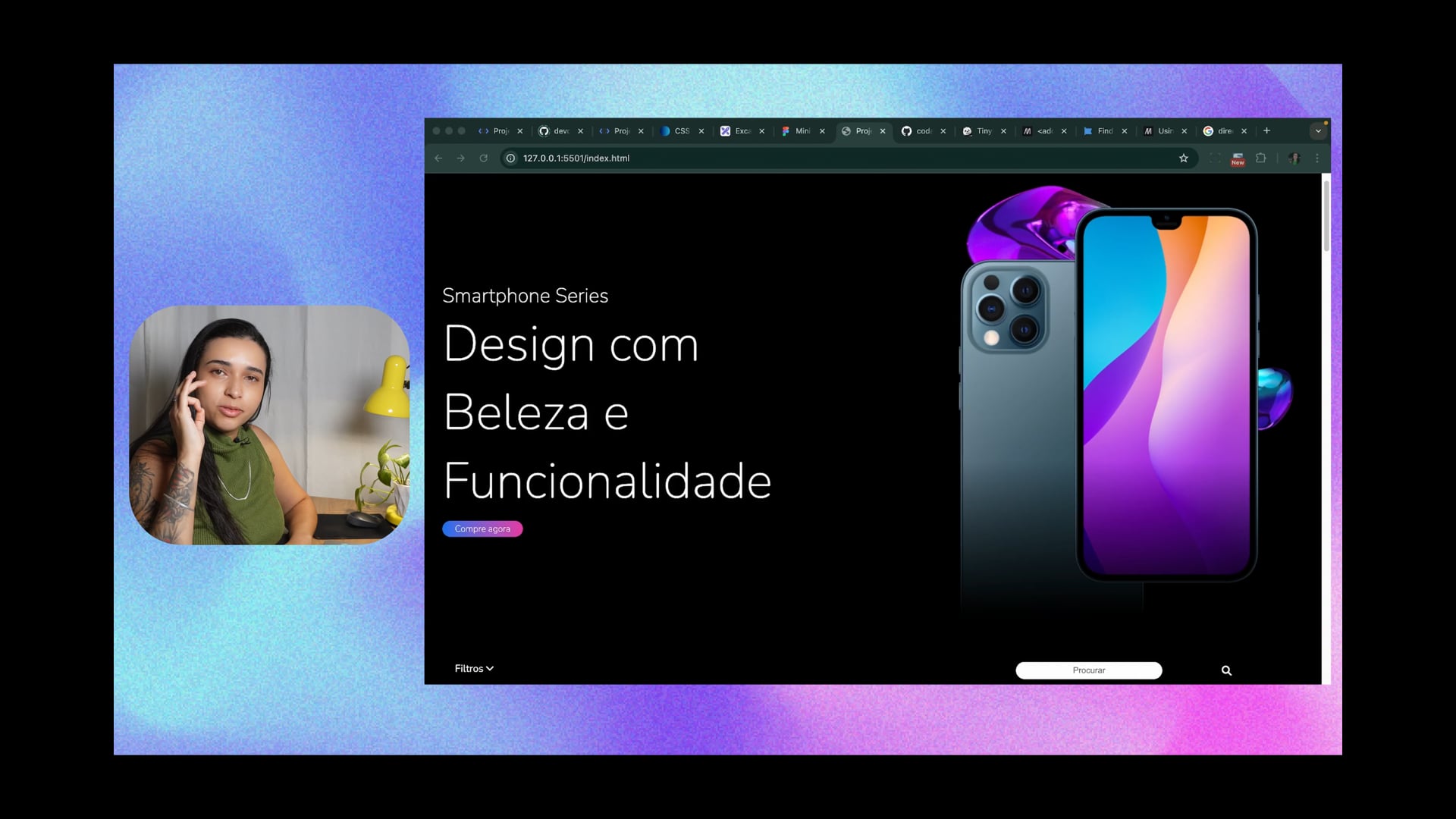 Estamos ajustando a exibição dos iPhones na landing page. Utilizamos display flex para alinhar os produtos lado a lado, ajustamos porcentagens para melhor visualização e verificamos responsividade no mobile. Adicionamos margem e refinamos detalhes visuais para aprimorar o layout.
