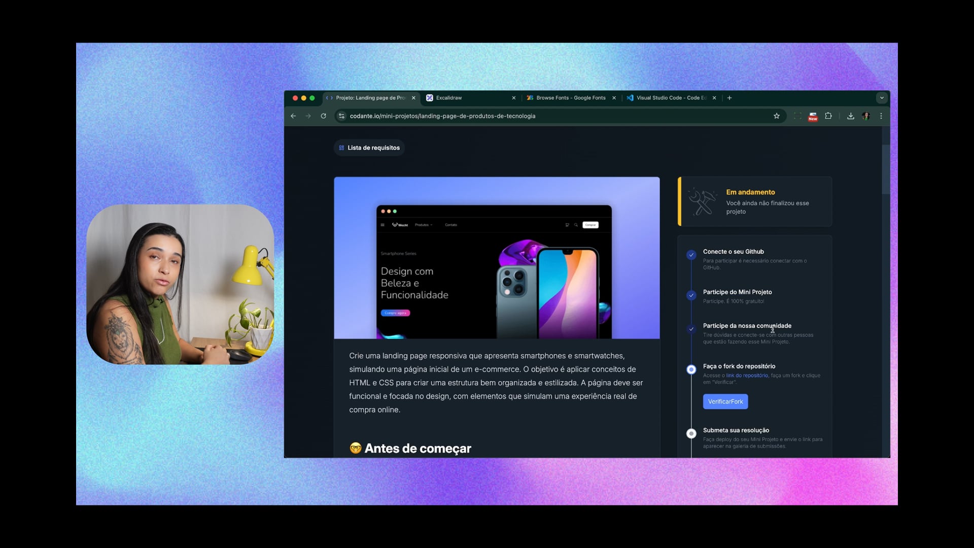 Conectamos nosso GitHub, ingressamos na comunidade e servidor Discord para suporte. Fizemos um fork do repositório, clonamos no terminal e abrimos no VS Code. Dúvidas são respondidas na comunidade.