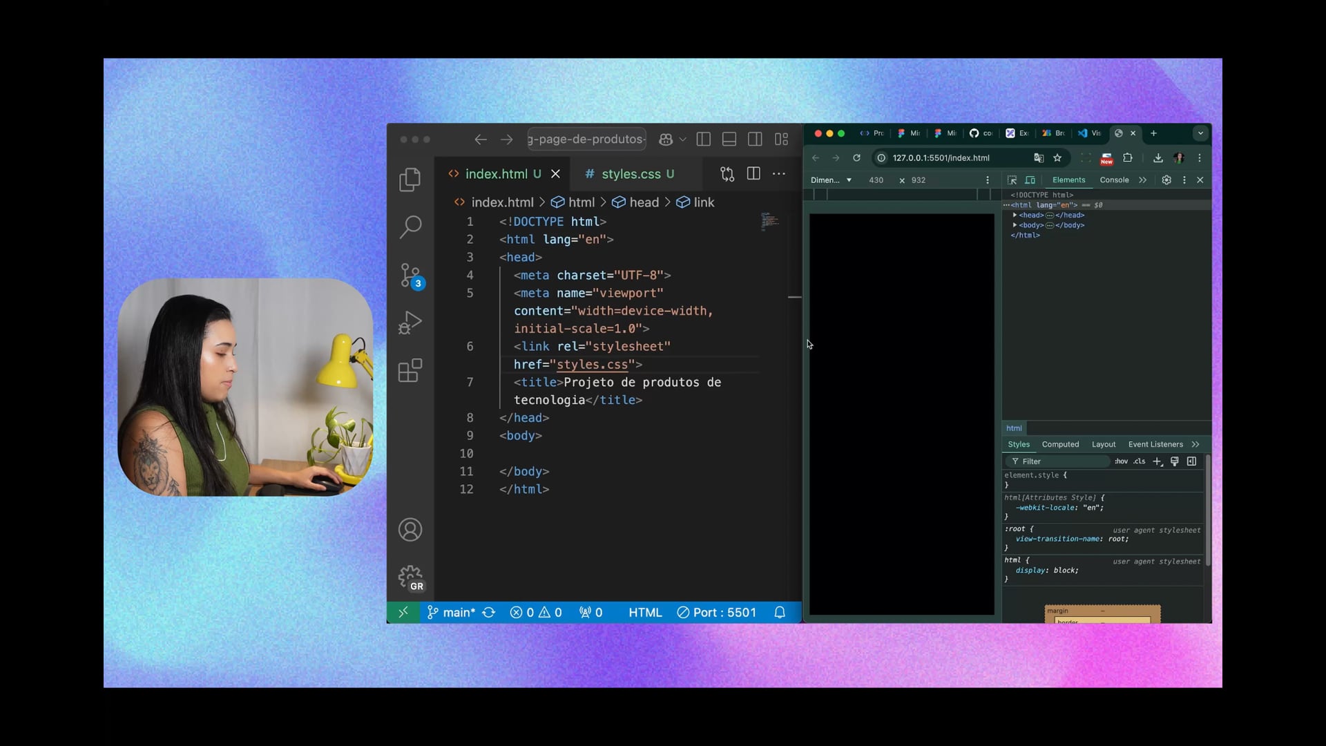 Definimos o background como preto usando variáveis no CSS para facilitar futuras alterações. Adicionamos e descrevemos imagens no HTML. Removemos margens/paddings padrões nos navegadores e organizamos o layout inicial.