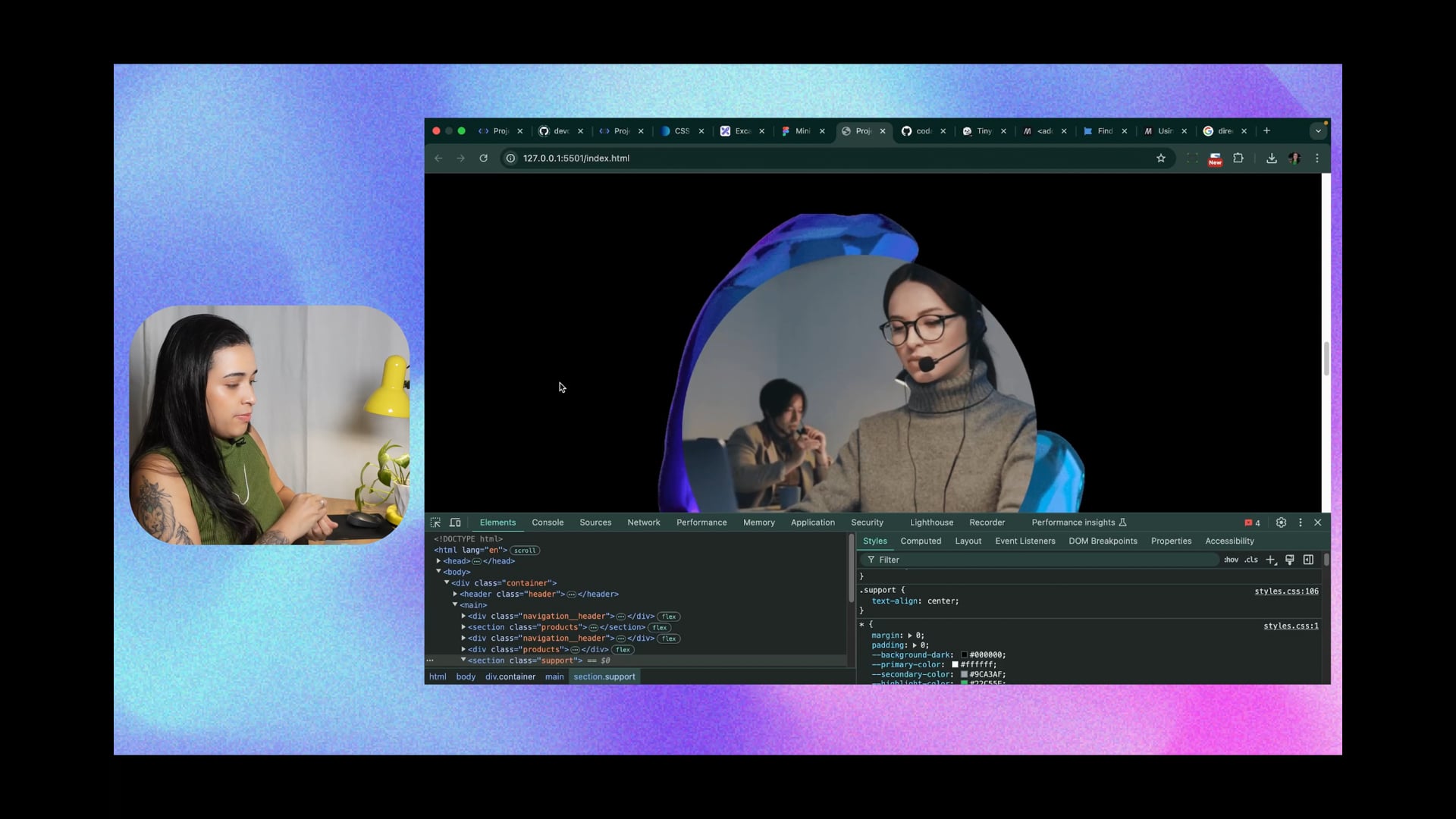 Ajeitamos a seção de suporte, ajustando a ordem dos elementos com flex-direction reverse, espaçamento e fonte. E, aumentamos o font-size em formulários e placeholders, melhorando a legibilidade e estética. Finalizamos o ajuste do layout.