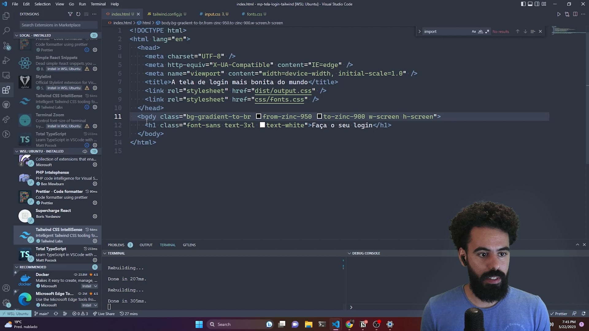 Vamos fazer o card central com o formulário. Também mostra como passar valores arbitrários nas classes do Tailwind para conseguir uma customização ainda maior.