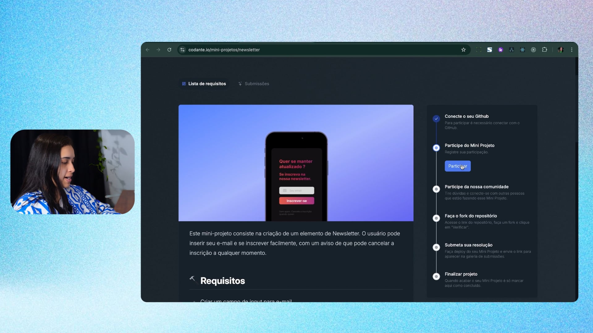 Seguimos o passo a passo para fazer o fork do repositório, clonar no terminal, criar e configurar o HTML e CSS, e usar o Tailwind. Explicamos como exportar ícones do Figma.