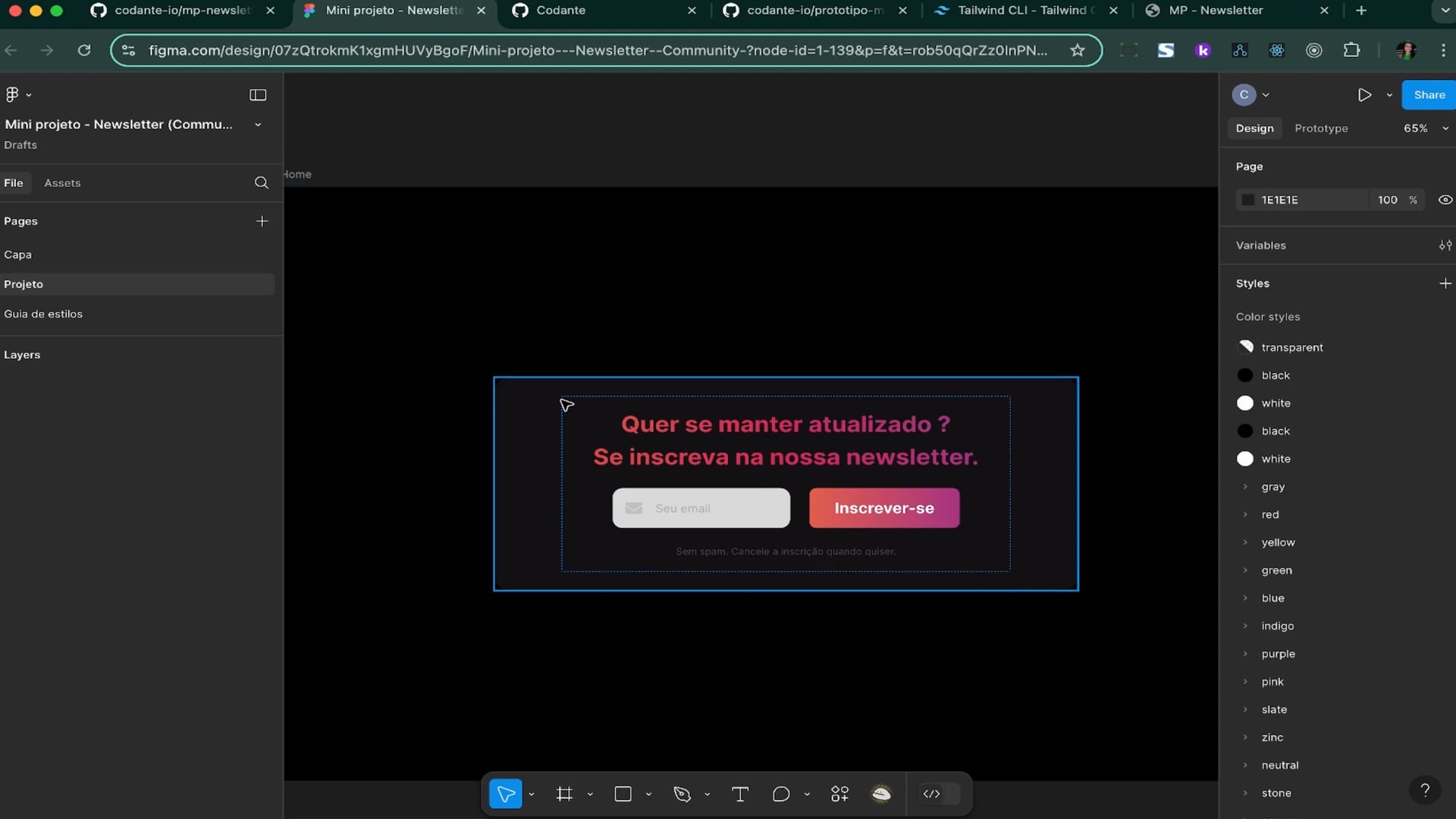 Estamos estruturando o design da nossa newsletter no HTML e ajustando estilos com Tailwind. Criamos o cabeçalho, formulário de inscrição e mensagens auxiliares, garantindo que o layout esteja centralizado e alinhado corretamente.