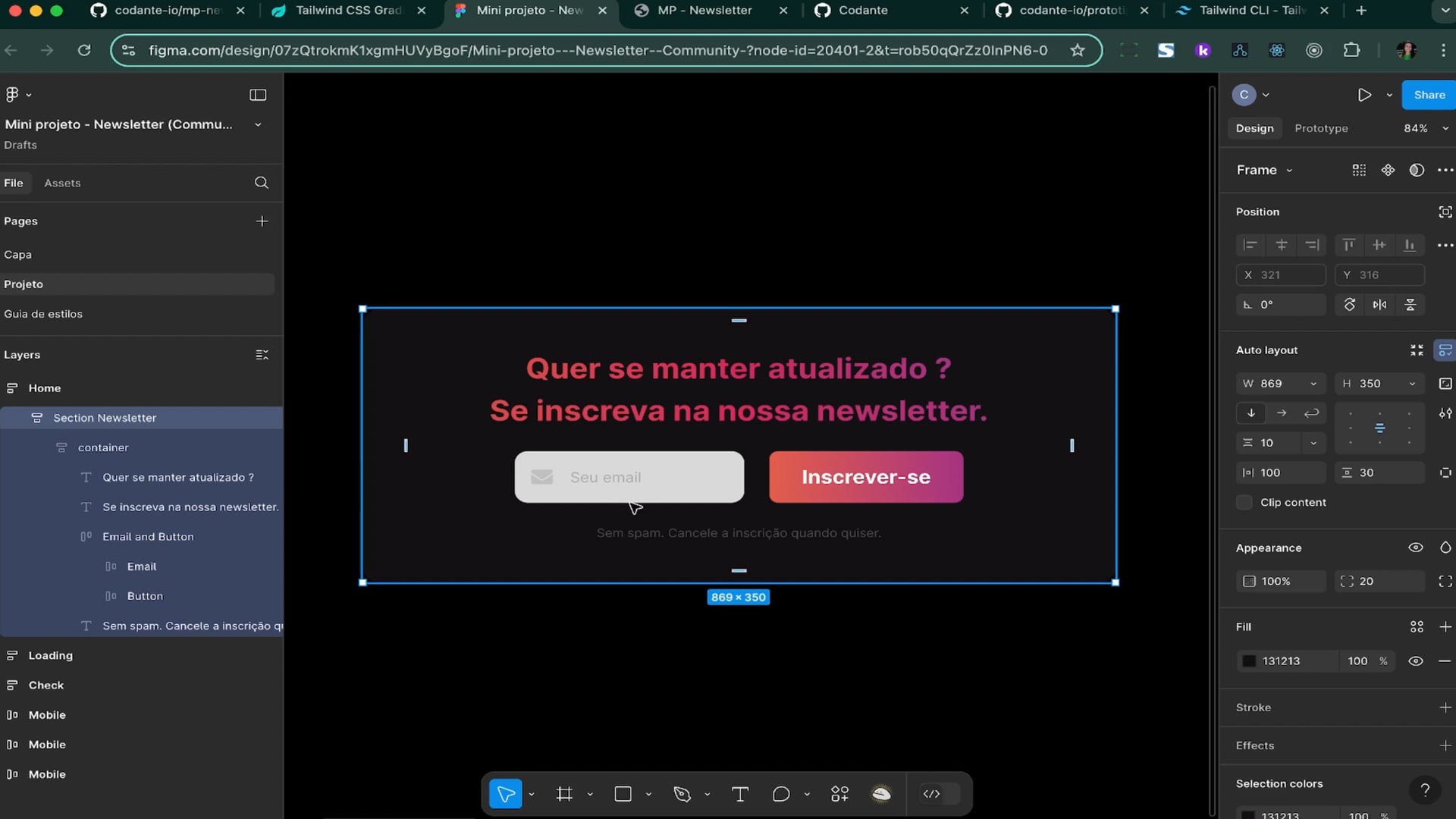 Estamos estilizando o campo de e-mail na nossa newsletter. Baixamos o ícone correspondente e ajustamos o layout usando Tailwind. Aplicamos bordas, centralizamos itens e ajustamos espaçamentos para melhorar a aparência.