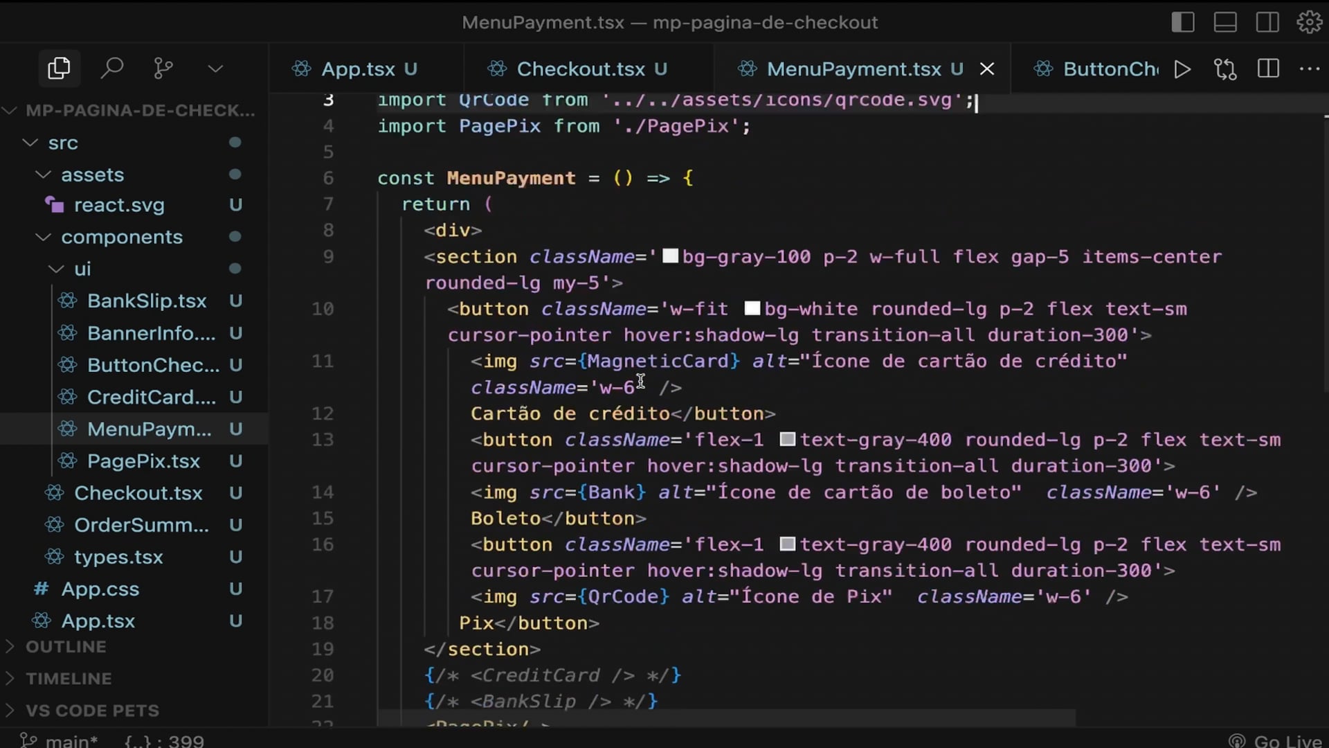 Desenvolvemos a lógica de alternância entre as opções de pagamento (cartão de crédito, boleto e Pix) no nosso checkout. Utilizamos `useState` para armazenar o pagamento selecionado, ajustamos o `onClick` e aplicamos estilizações dinâmicas usando TailwindCSS para destacar a opção ativa corretamente.
