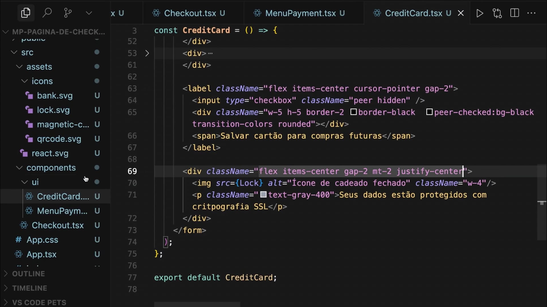 Ajustamos o espaçamento entre elementos e criamos um componente de botão reutilizável no checkout, usando TailwindCSS para estilização. Implementamos lógica para variantes como `finalizar pagamento` e `gerar boleto`.