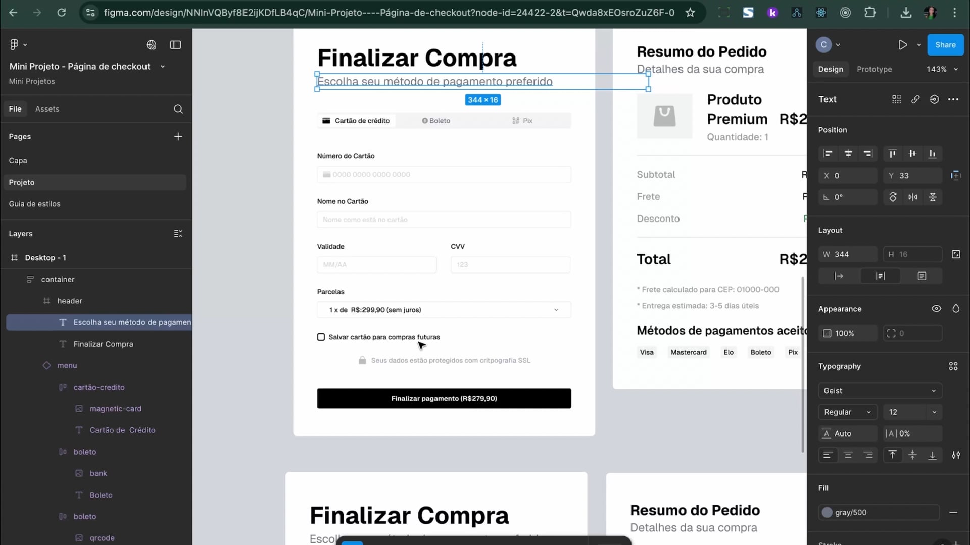 Criamos um formulário para informações de cartão de crédito em nosso projeto. Adicionamos inputs para número, nome, validade, CVC e opções de parcelamento. Finalizamos com um checkbox para opção de salvar cartão.