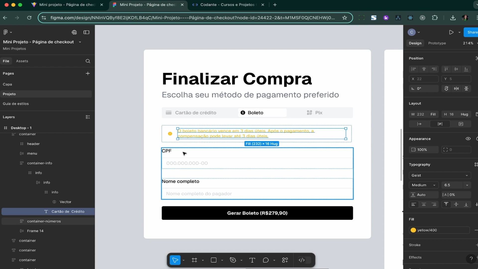 Criamos uma seção para geração de boletos, usando `BankSlip`. Ajustamos estilizações e espaço com TailwindCSS, adicionamos inputs para CPF e nome completo, e configuramos um botão `Gerar Boleto` com valor total do pedido.