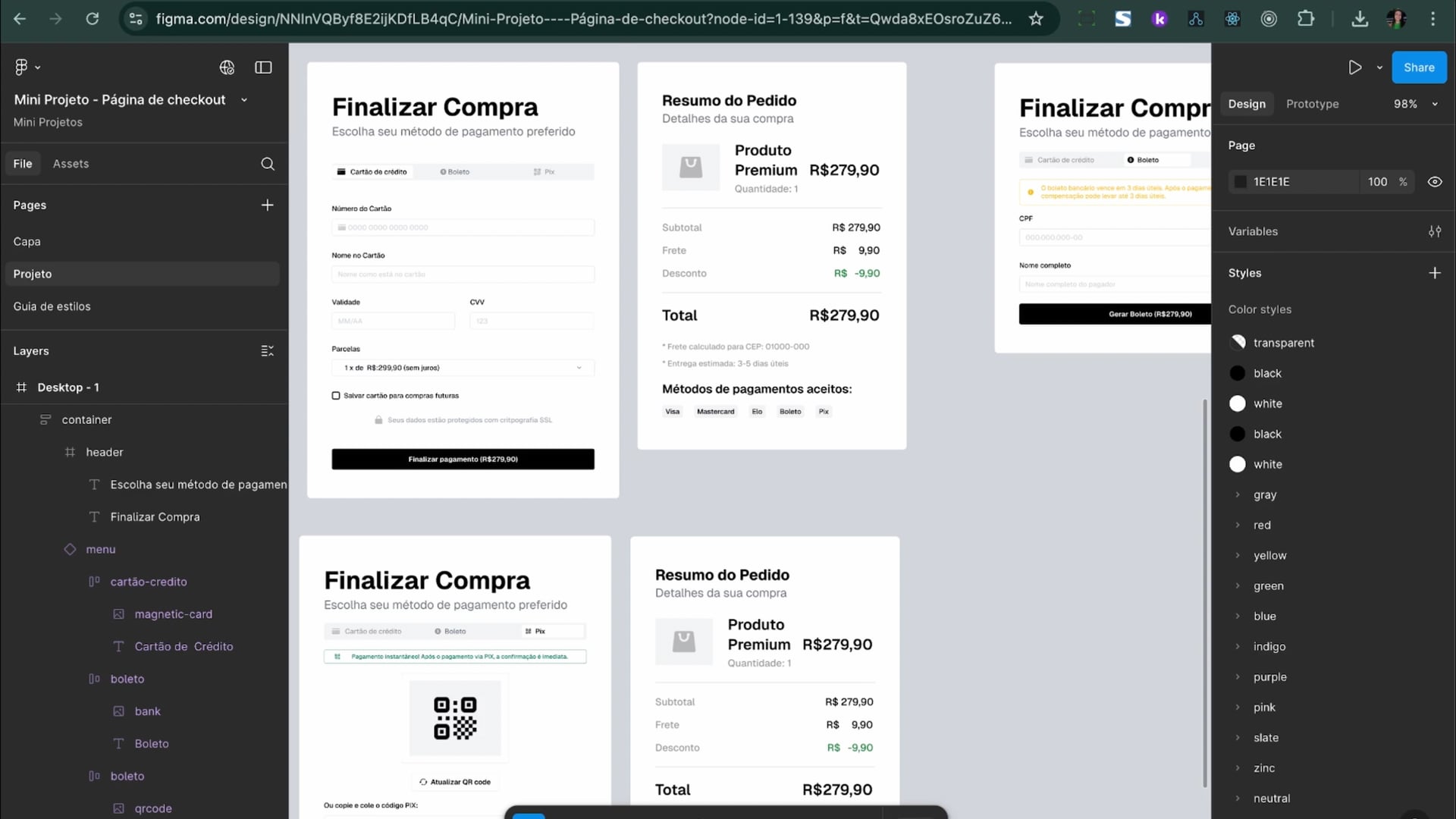 Dividimos nossa aplicação em componentes, como menu e opções de pagamento. Criamos um layout com TailwindCSS para o checkout, estilizando botões e icones, melhorando organização visual e interatividade em nossa página.