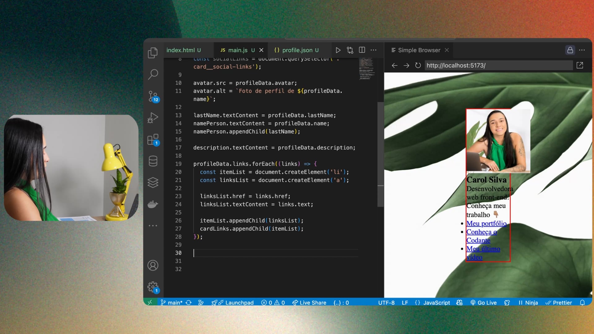 Criamos elementos de lista para redes sociais dinamicamente, integrando links, imagens e configurando abertura em nova janela. Utilizamos JavaScript para inserir esses elementos no DOM, facilitando atualizações futuras de forma prática.