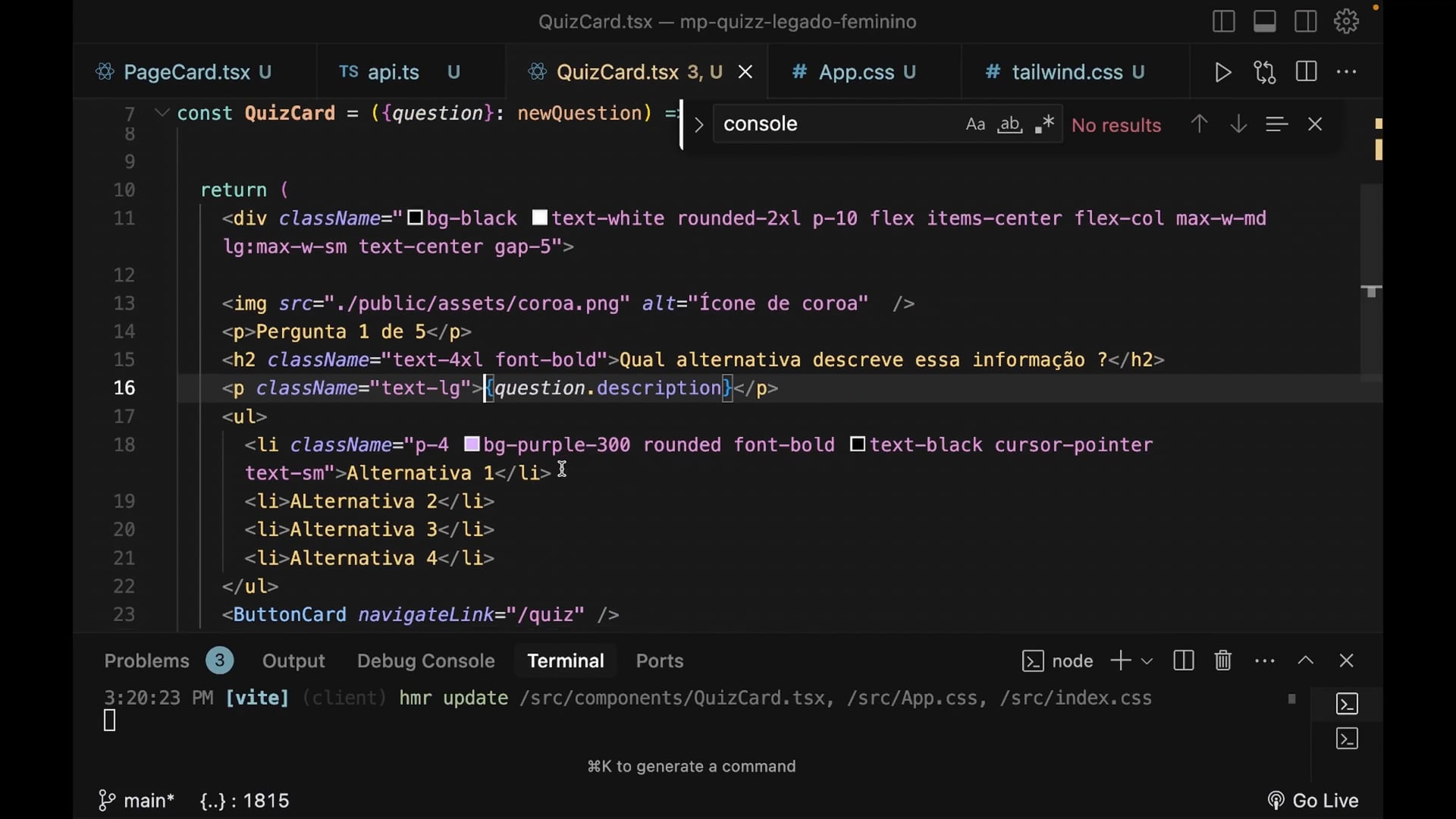Estamos ajustando a exibição das alternativas no quiz, aplicando um layout flexível e truncando nomes longos. Melhoramos o espaçamento e alteramos o texto do botão para `próxima pergunta`.