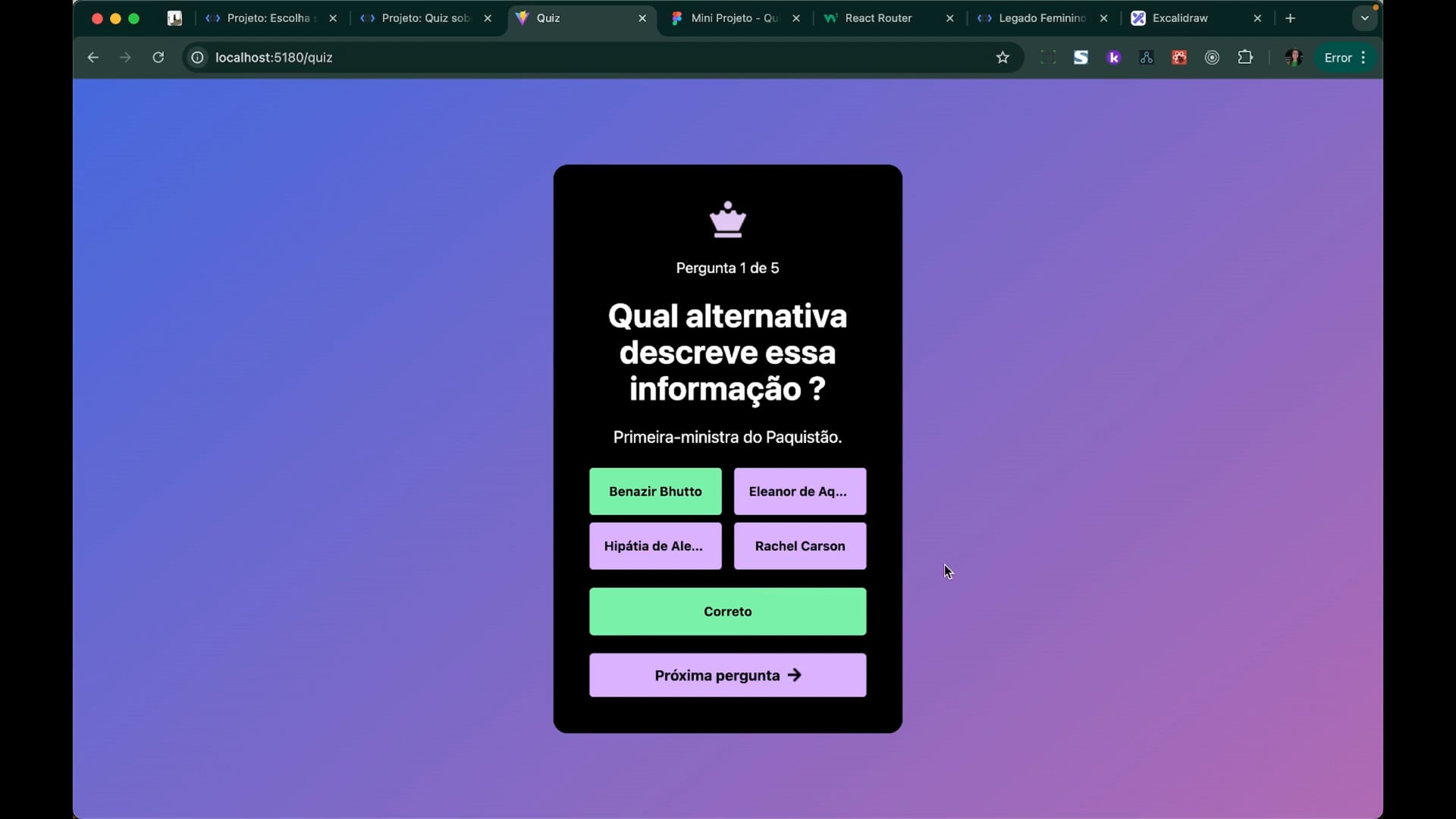 Estamos corrigindo dois erros no quiz: primeiro, o feedback de respostas corretas/incorretas persiste na próxima pergunta, então reseta-se o estado na próxima pergunta. Em seguida, embaralhamos opções para corrigir a repetição das alternativas. Além disso, ajustamos a exibição do número da pergunta e preparamos para armazenar pontuações.