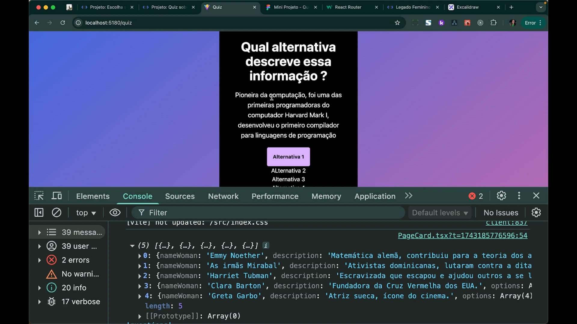 Substituímos placeholders no quiz card para receber e exibir perguntas do array `new question`. Criamos um tipo TypeScript para organizar nome, descrição e opções. Adicionamos lógica para exibir cards somente quando houver perguntas disponíveis, facilitando a integração das alternativas.