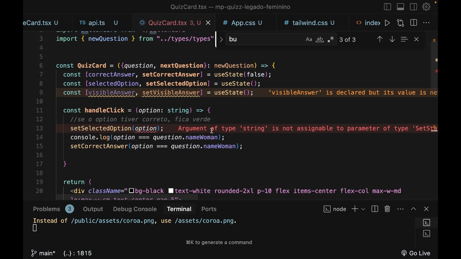 Estamos melhorando o feedback visual de respostas corretas e incorretas no nosso quiz. Ajustamos a interface para representar corretamente cada situação com cores e mensagem explicativa. Exploramos conceitos como `useState`, tipagem e passagem de props agregando aprendizado em React e Tailwind.