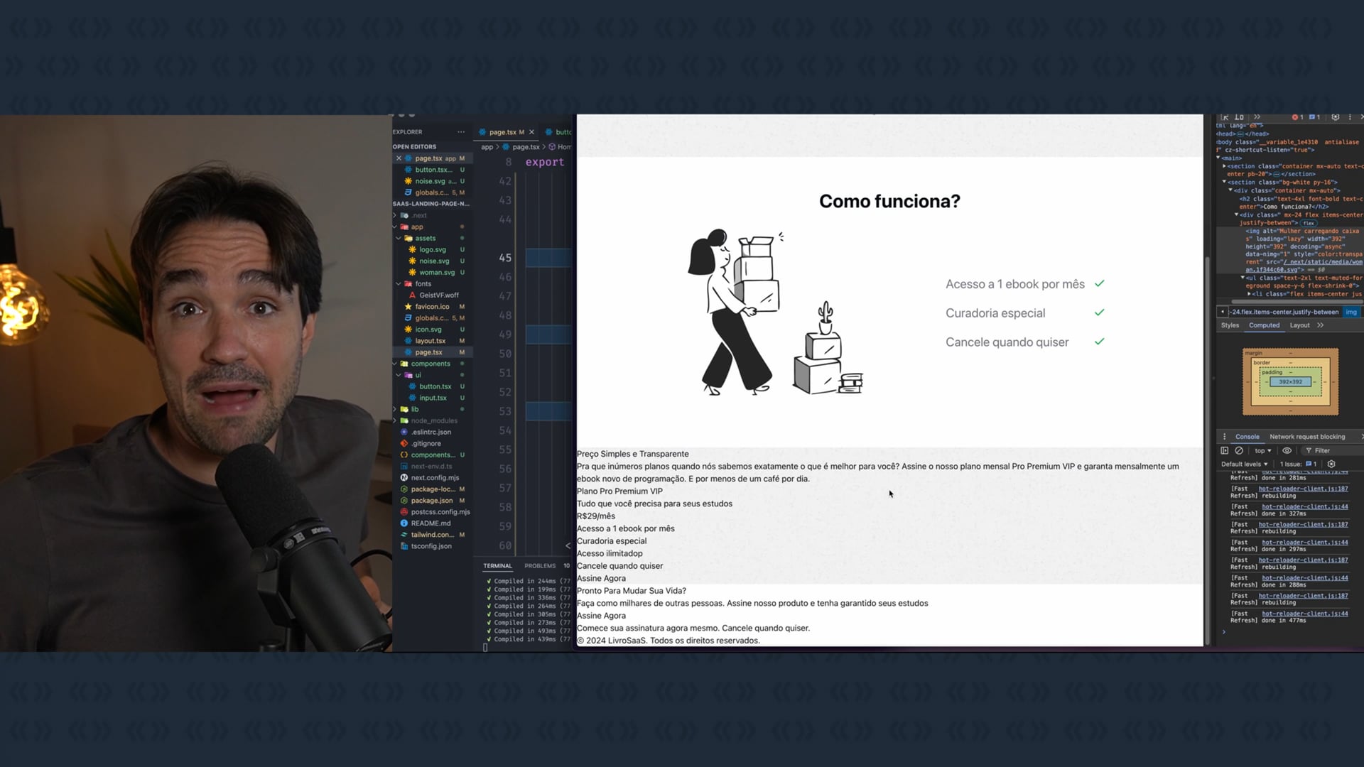 Desenvolvemos a seção de preços da landing page, utilizando o design do Figma e implementando um card com Shadcn/UI para estrutura e estilo. Centralizamos e configuramos elementos como título, preço e características dos planos.