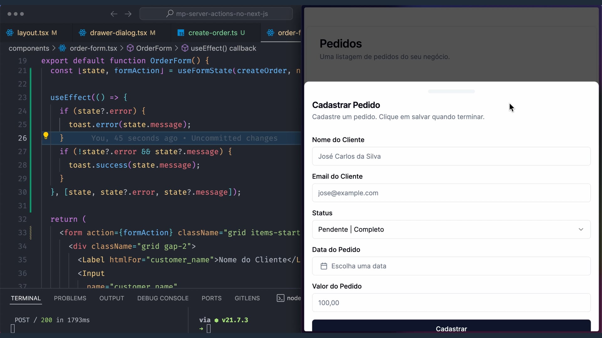 Vamos implementar a funcionalidade de fechar automaticamente o modal após o sucesso no cadastro de pedidos. Passamos o estado `setOpen` para o componente do formulário e configuramos para fechar o modal em caso de sucesso, mantendo-o aberto em caso de erro. Ajustamos a validação para garantir que valores monetários sejam passados corretamente em centavos para a API.