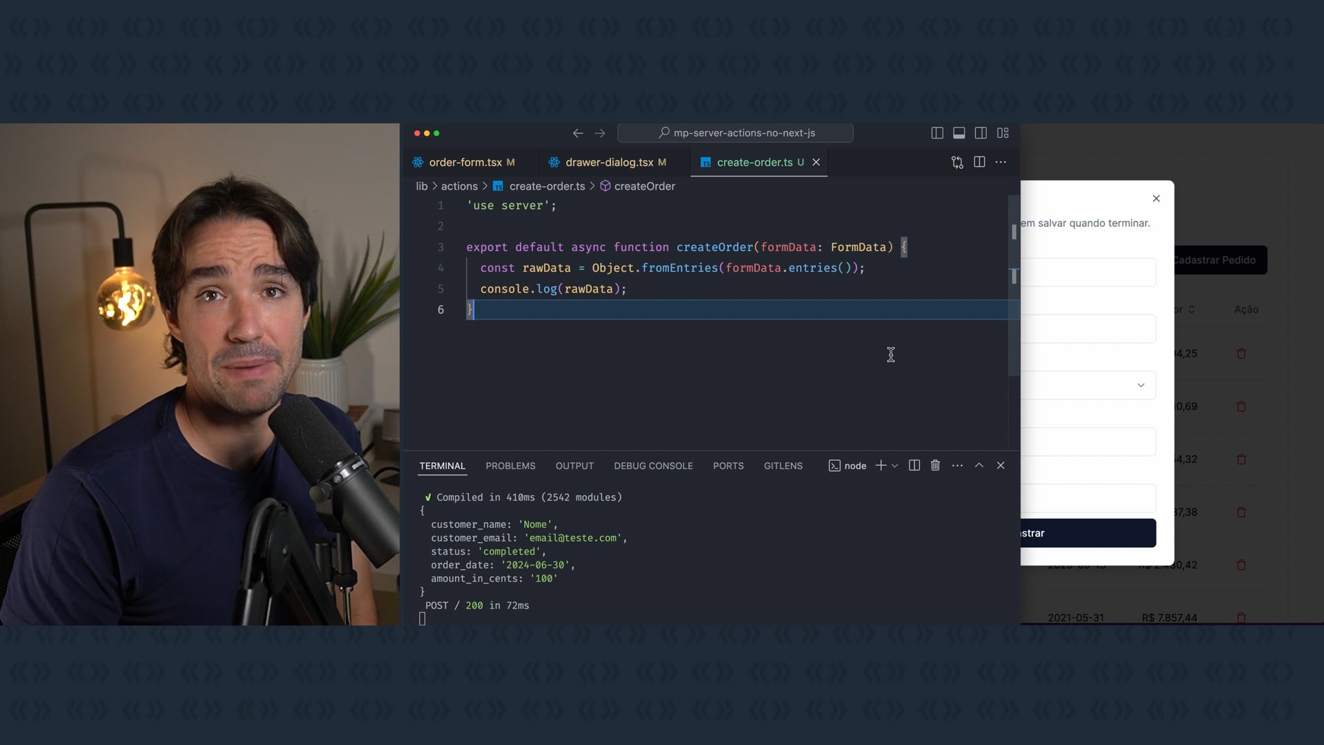 Agora que recebemos todos os dados na server action, vamos fazer uma chamada POST para a API e criar um novo pedido. Verificamos se os dados estão corretos com `console.log`, realizamos o fetch e confirmamos o status 201 de criação. Em seguida, implementamos `revalidatePath` para atualizar a página sem recarregar, garantindo feedback instantâneo ao usuário. Por fim, vamos adicionar uma validação simples ao formulário HTML.
