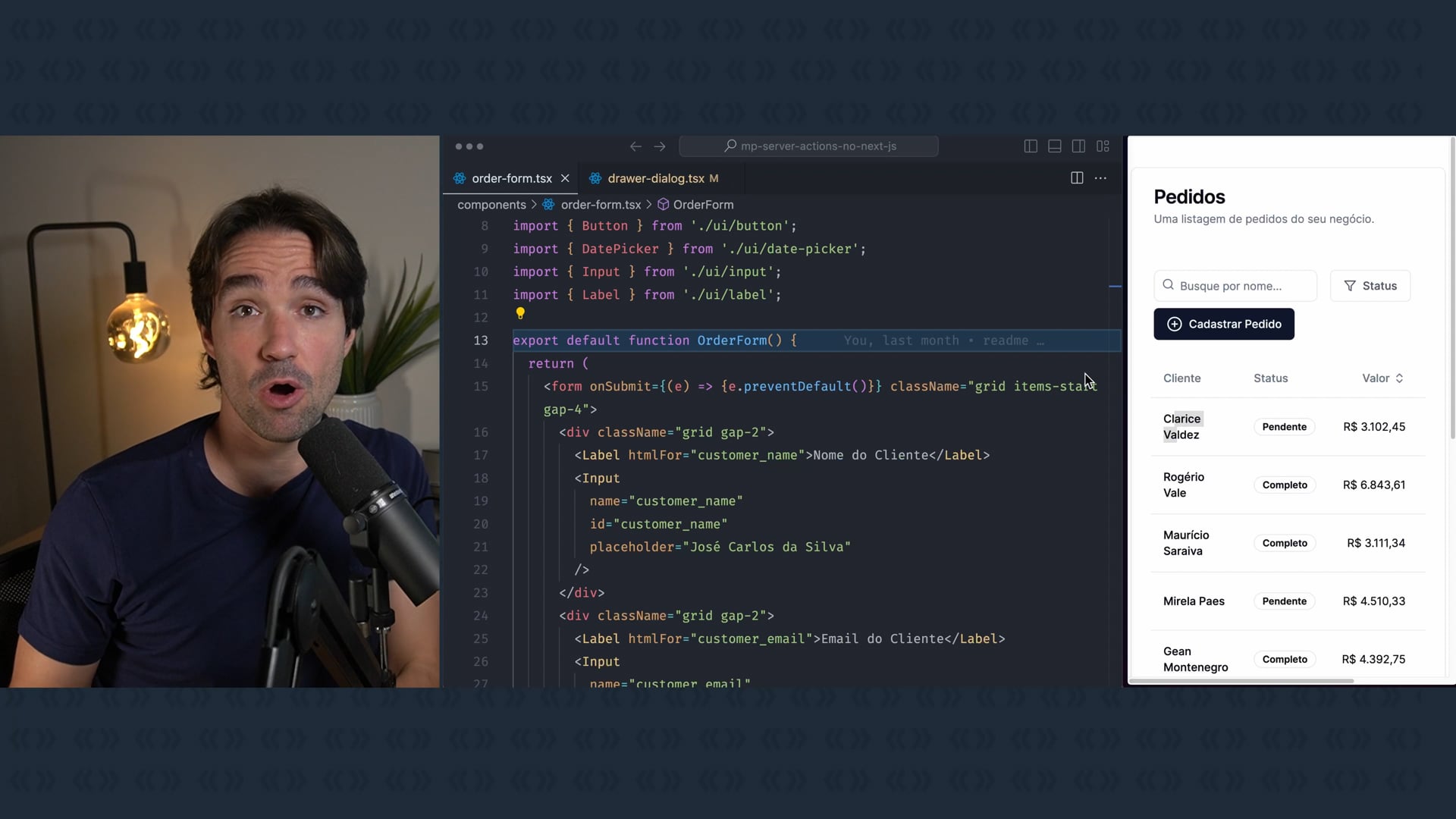Vamos criar a server action para cadastrar pedidos, que roda no servidor e mantém nossas chaves API seguras. Primeiro, configuramos um console.log para verificar se a função executa no servidor.