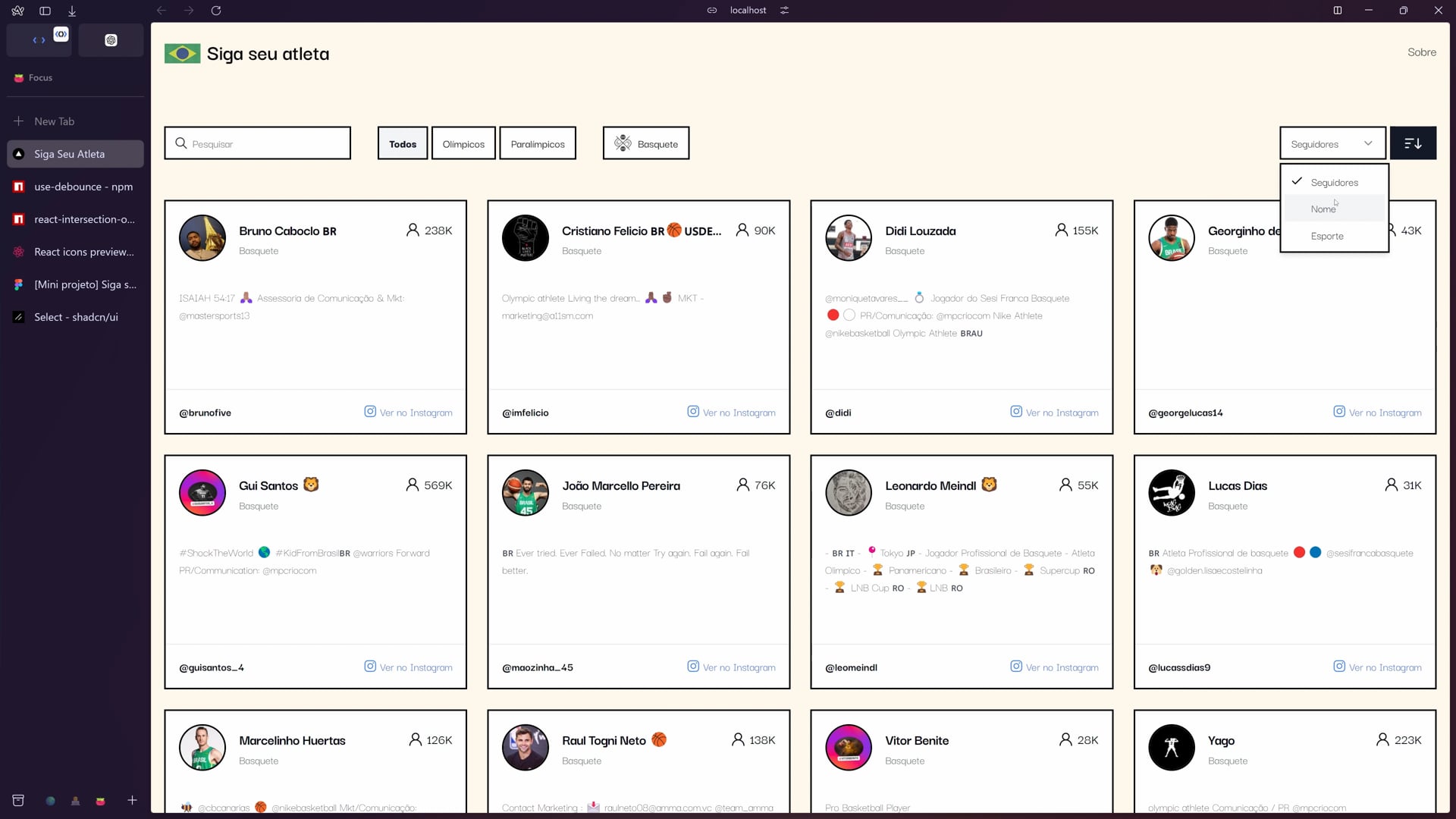 Finalizamos a integração da ordenação de atletas por nome, seguidores e esportes, garantindo que os filtros funcionem em conjunto. Agora, vamos focar na responsividade da aplicação para dispositivos móveis.