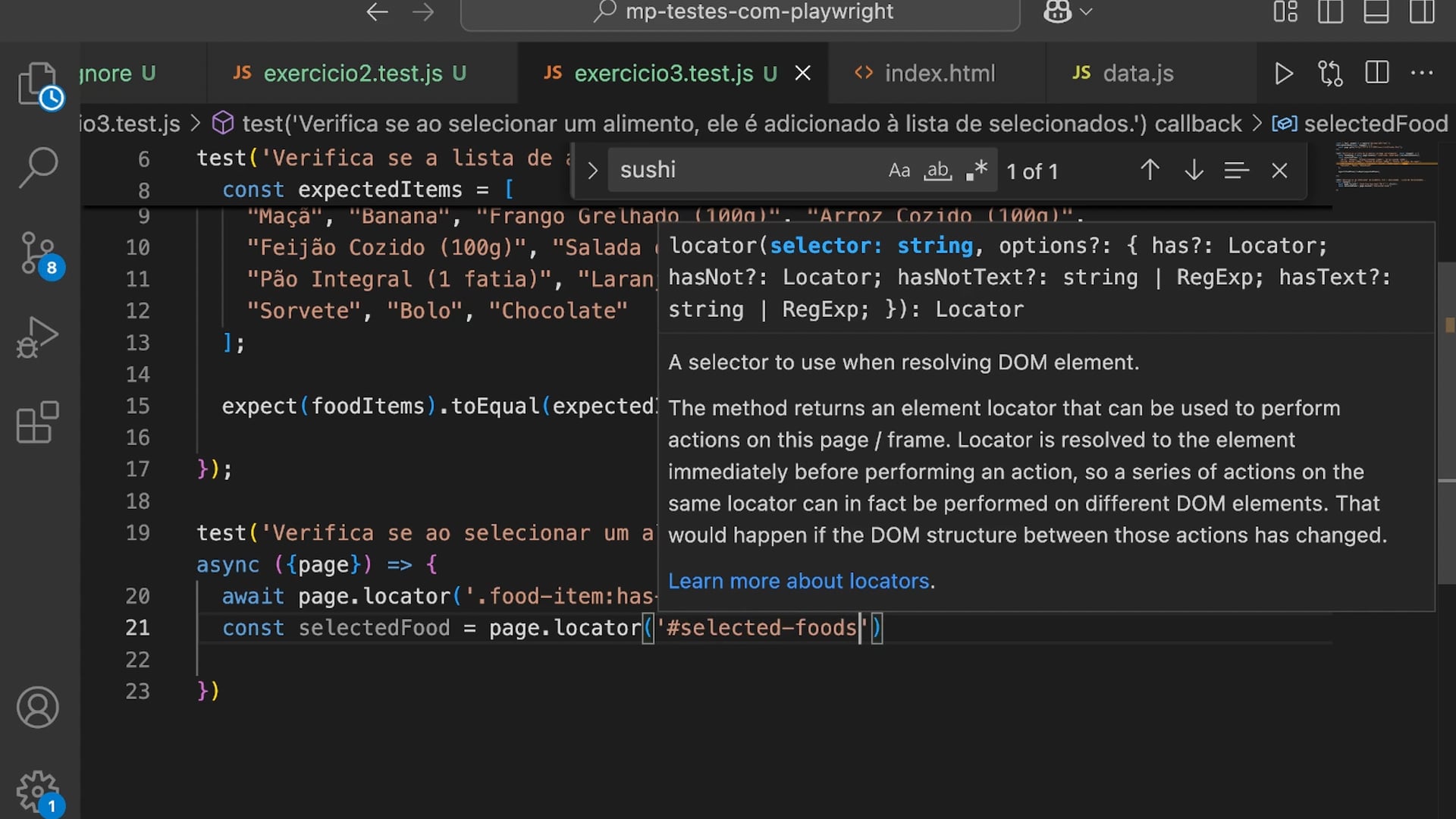 Ajustamos e testamos a funcionalidade de adicionar alimentos à lista de selecionados, verificando se ao clicar em `maçã`, ela aparece na lista. Exploramos diferentes métodos de seleção de elementos e validamos o texto dos itens. Testamos múltiplos seleções de alimentos.