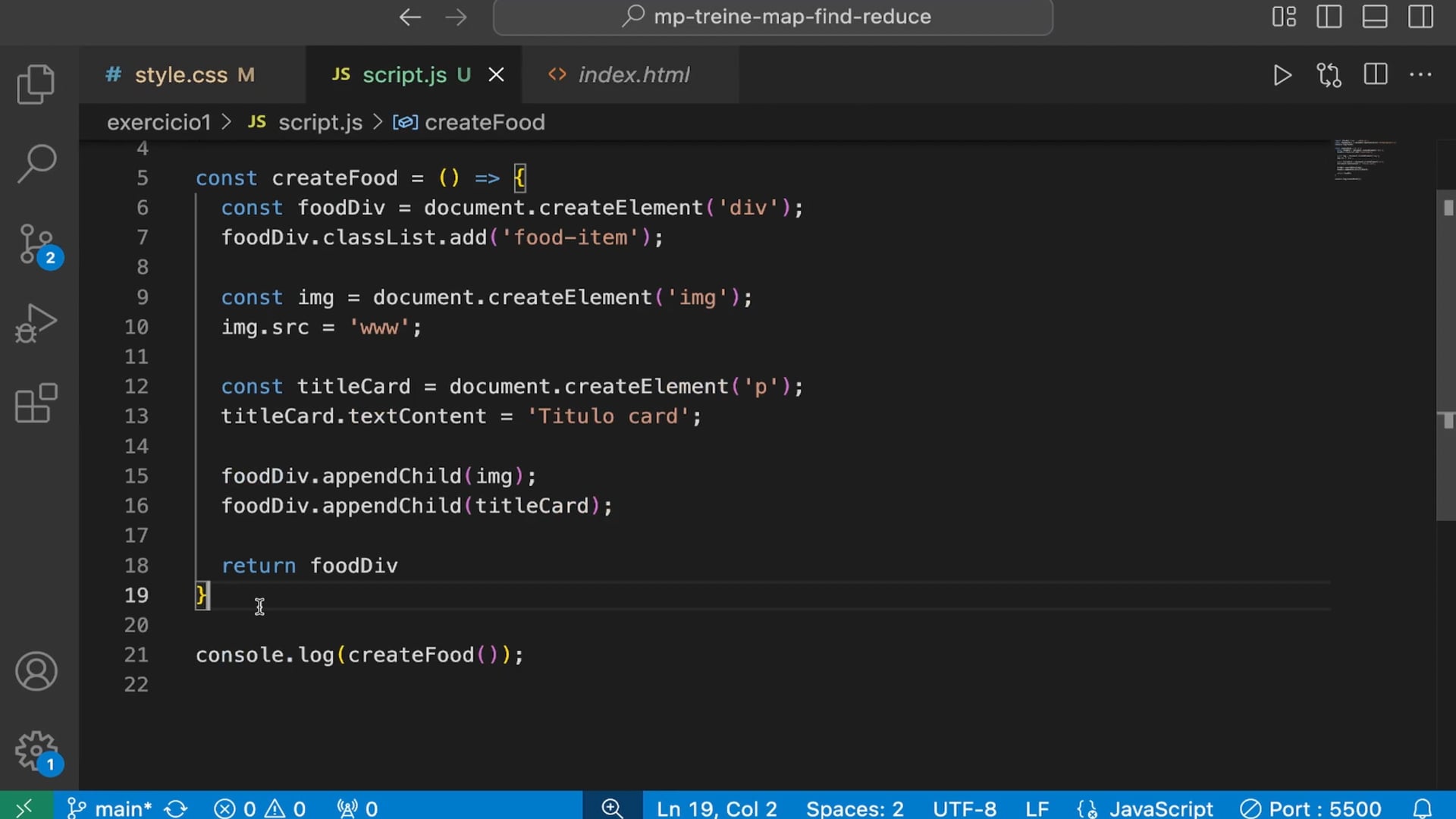 Usamos a função `map` para percorrer o array de alimentos e criar elementos `div` para cada item. Depois, adicionamos estes elementos à galeria de alimentos no HTML. Ajustamos o CSS para melhorar a exibição. Nossa próxima meta é garantir que as imagens e títulos dos alimentos sejam exibidos corretamente.
