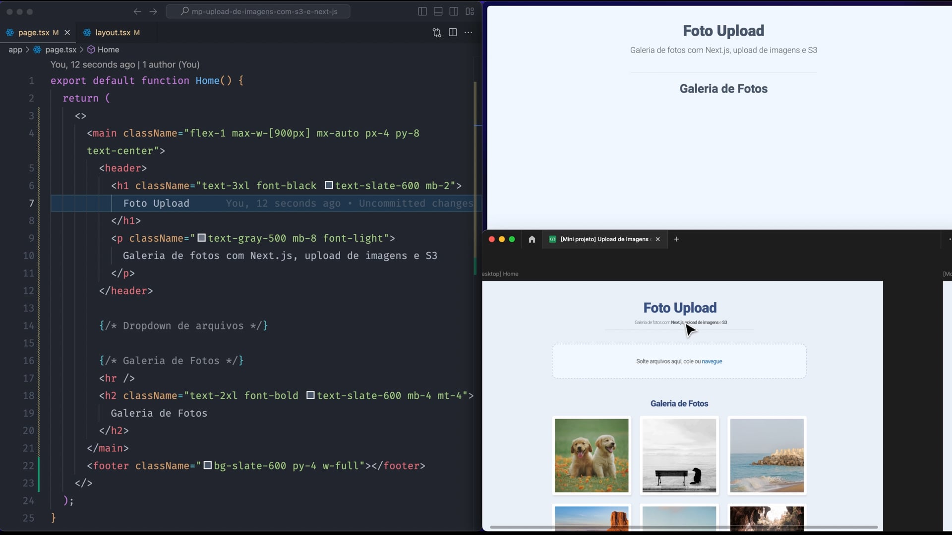 Importamos uma imagem do Pexels para montar nosso grid de fotos no Next.js. Renderizamos múltiplas fotos usando um array e personalizamos o layout com Tailwind CSS, incluindo sombras e bordas arredondadas. Na sequência, configuraremos o S3 para integrar as imagens dinamicamente.