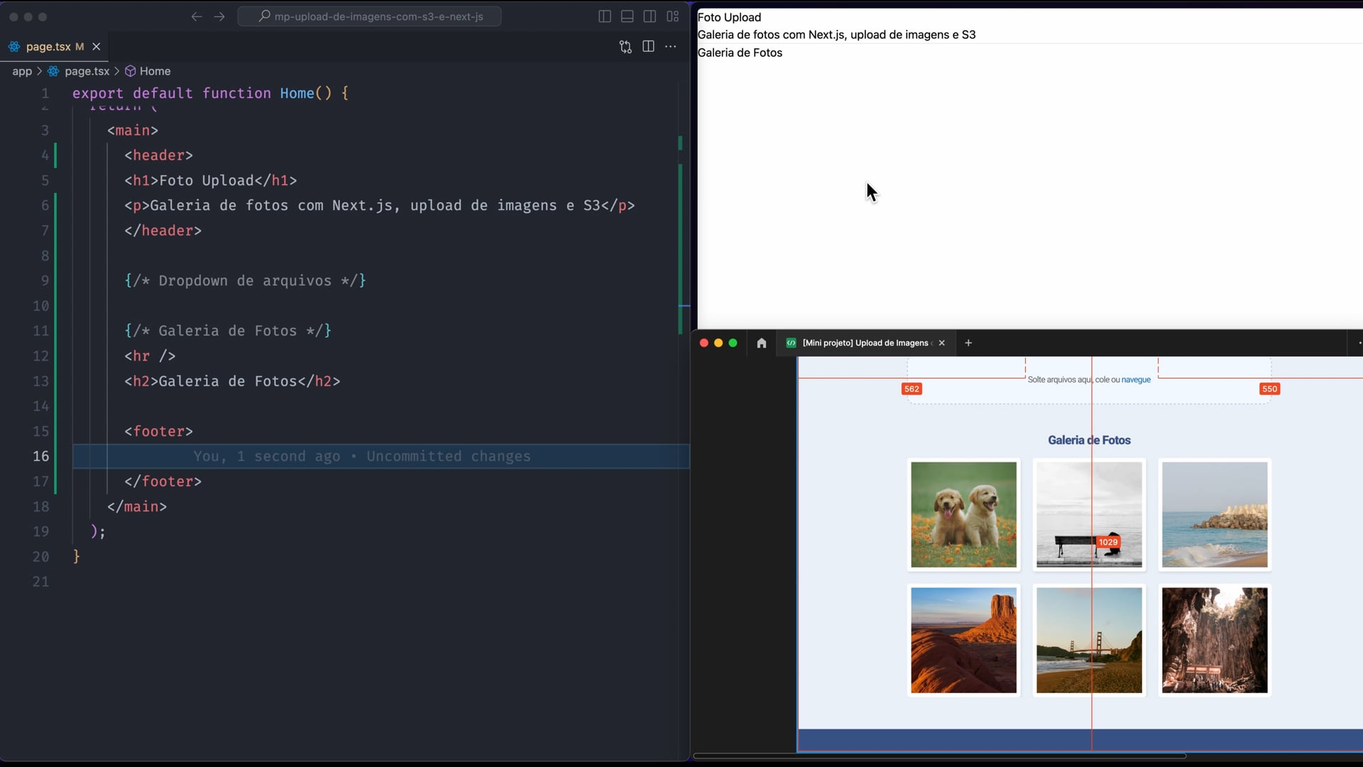 header: Contém o título principal "Foto Upload" e uma breve descrição do projeto.{/* Dropdown de arquivos */}: Um espaço reservado para a funcionalidade de upload que implementaremos posteriormente.{/* Galeria de Fotos */}: Contém o título "Galeria de Fotos" e um espaço reservado para exibir as fotos.footer: Um rodapé simples com um background escuro.2. Estilizando com Tailwind CSS